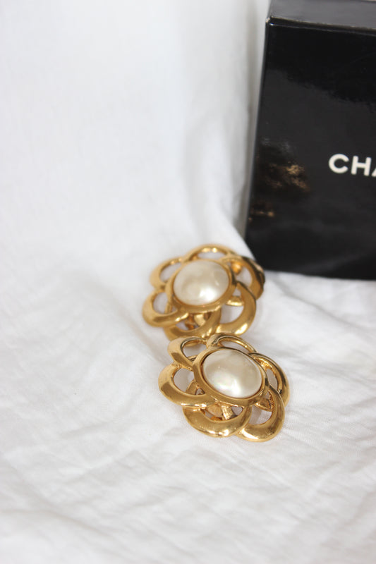 1980 CHANEL Camellia Clip-On Earrings – Gold & Faux Pearl, Vintage with Box