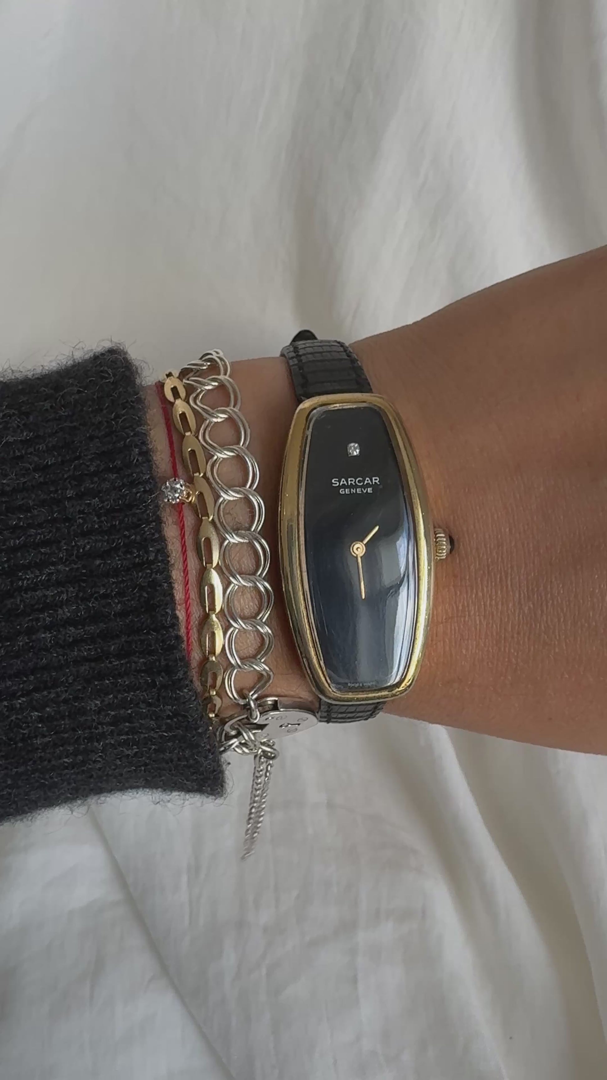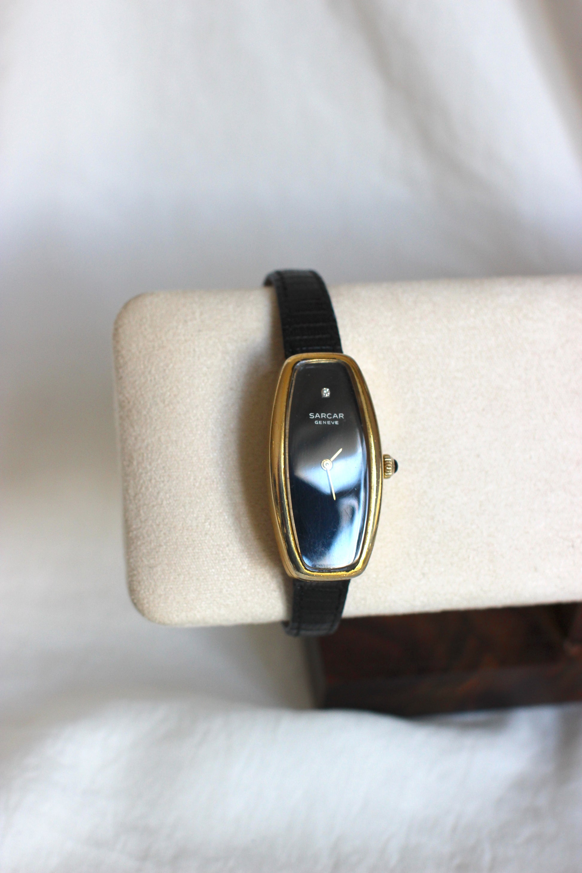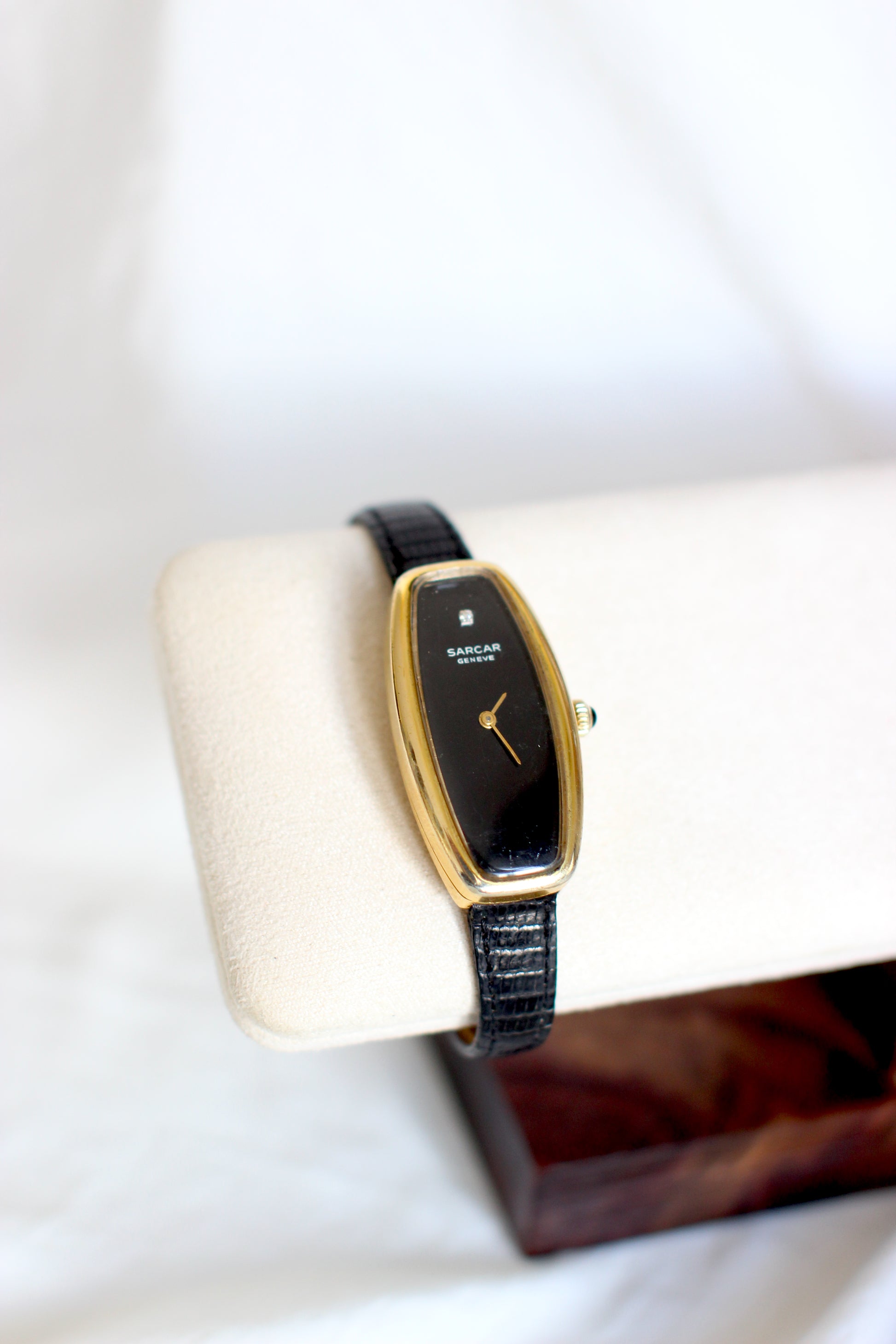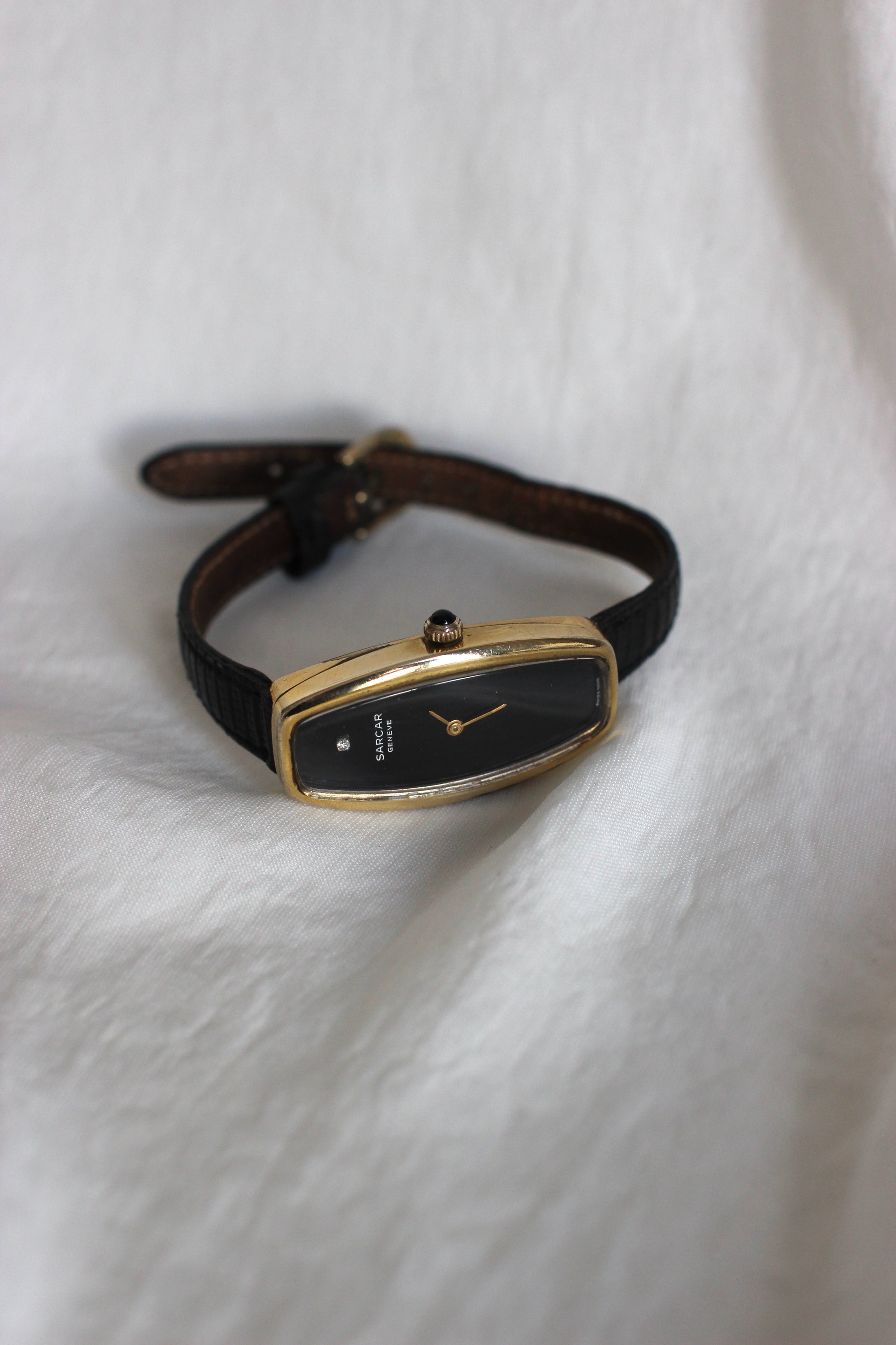 This opulent SARCAR Genève timepiece boasts a gold-plated case and a refined mechanical movement. Its black rectangular dial (4x2 cm) shines with a single brilliant gemstone at noon, adding an elegant touch. The crown is adorned with a delicate stone, while the premium leather strap reaches a maximum length of 19 cm for a sophisticated fit.