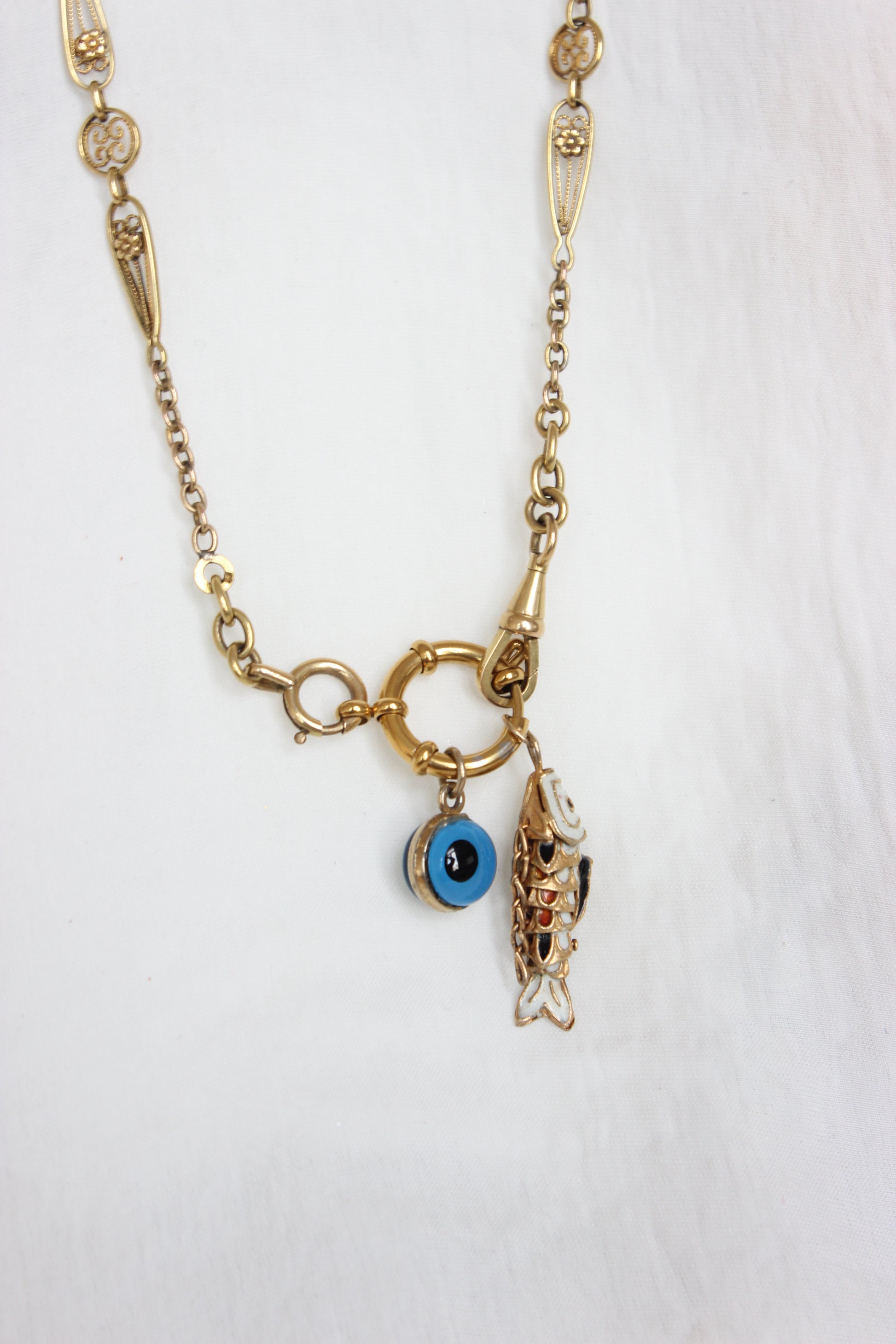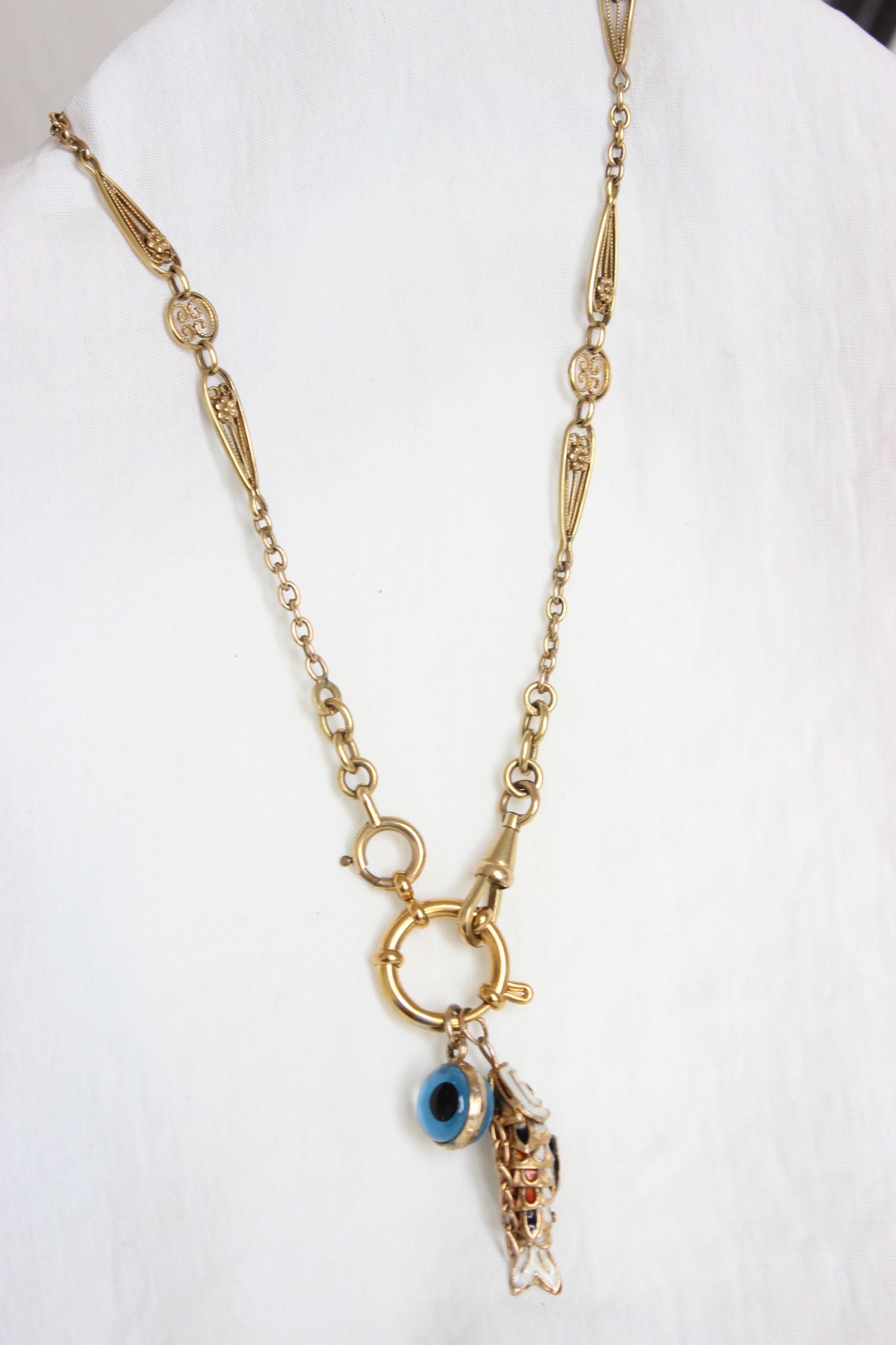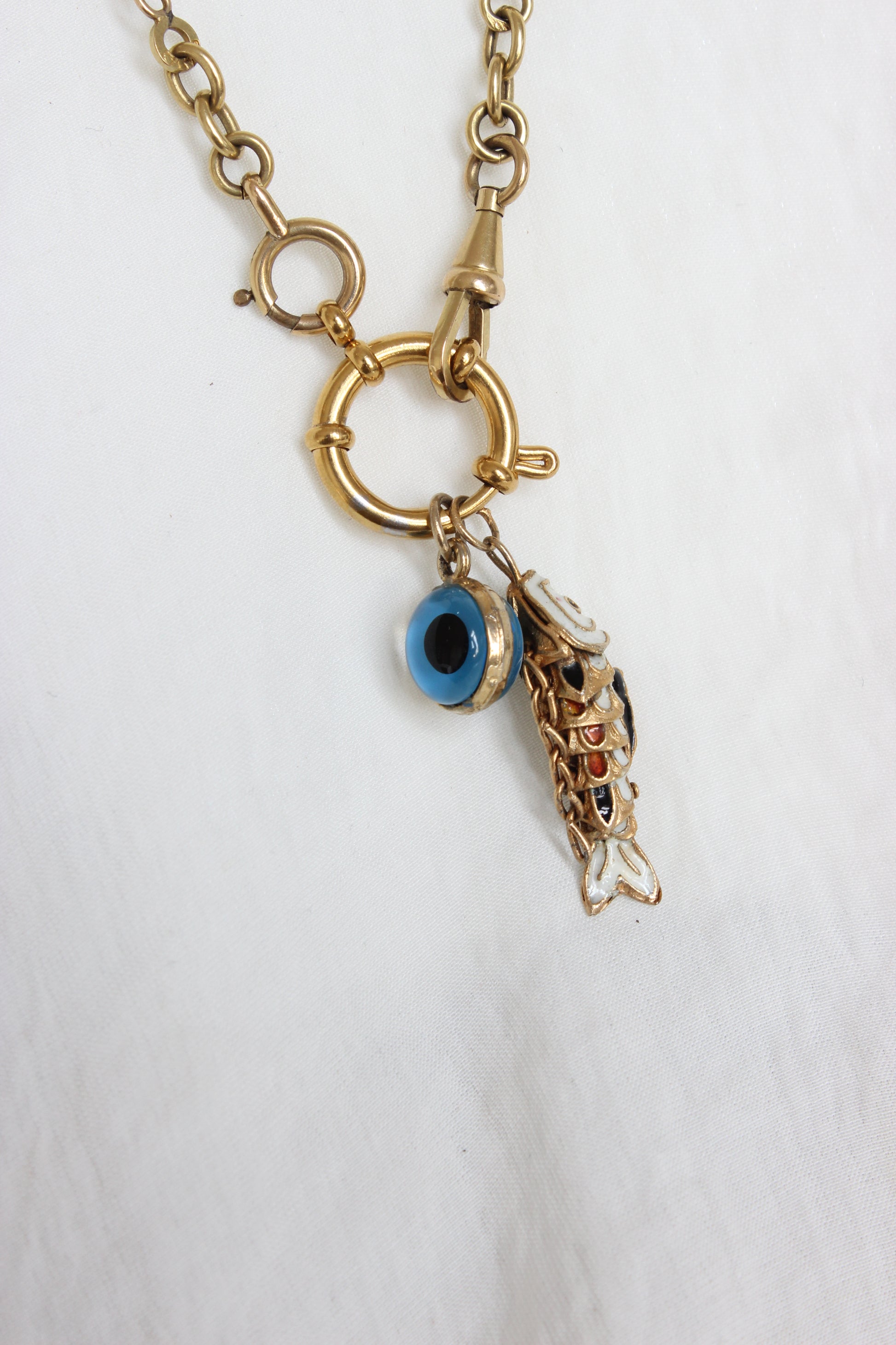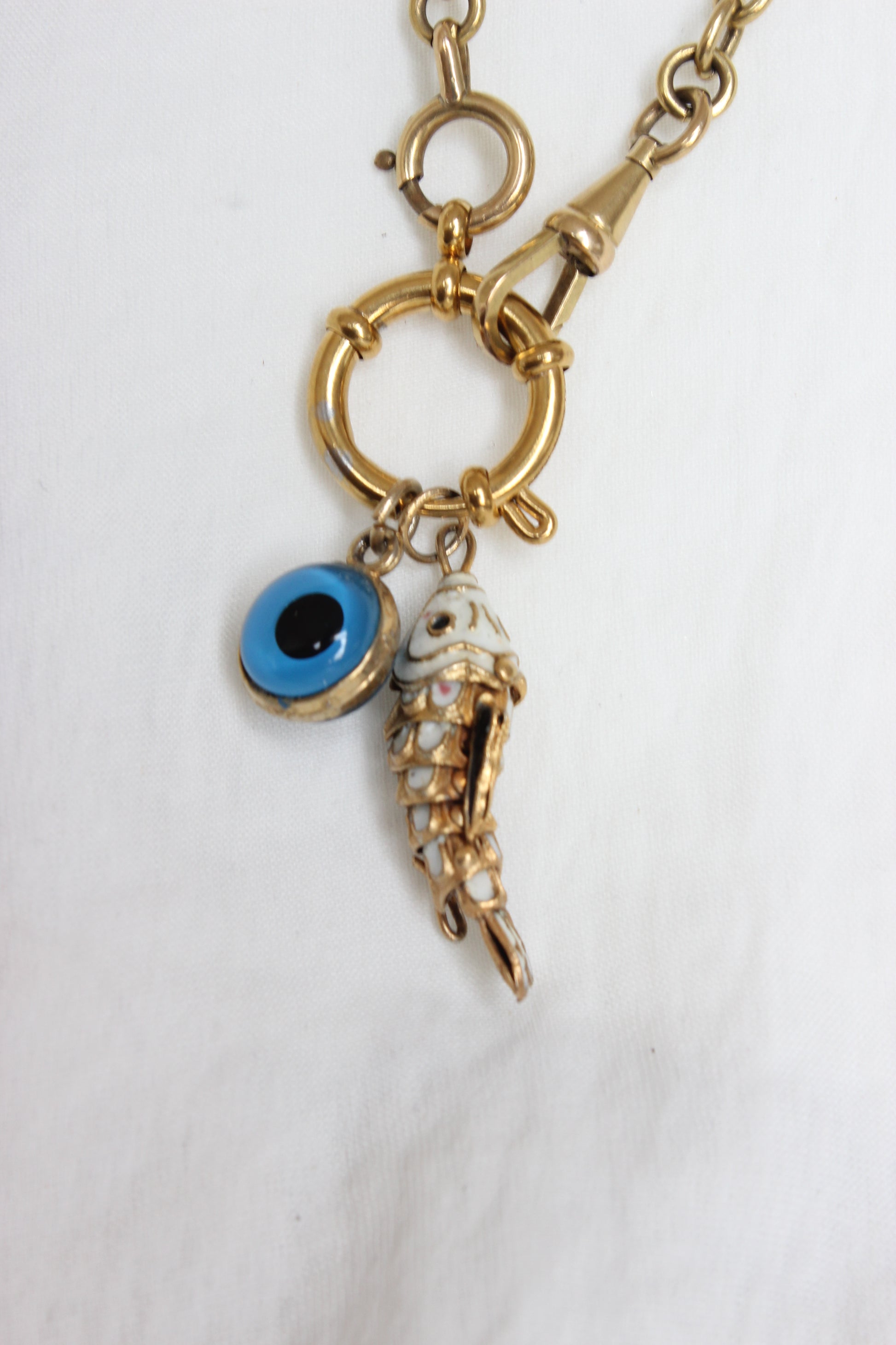 Introducing a timeless and versatile piece: a long vintage chain originally used to hold pocket watches, now reimagined to elegantly display a vintage chinese articulated fish and a glass "lucky eye" charm. This unique creation by Sou Caprices is a perfect blend of historical charm and modern elegance.