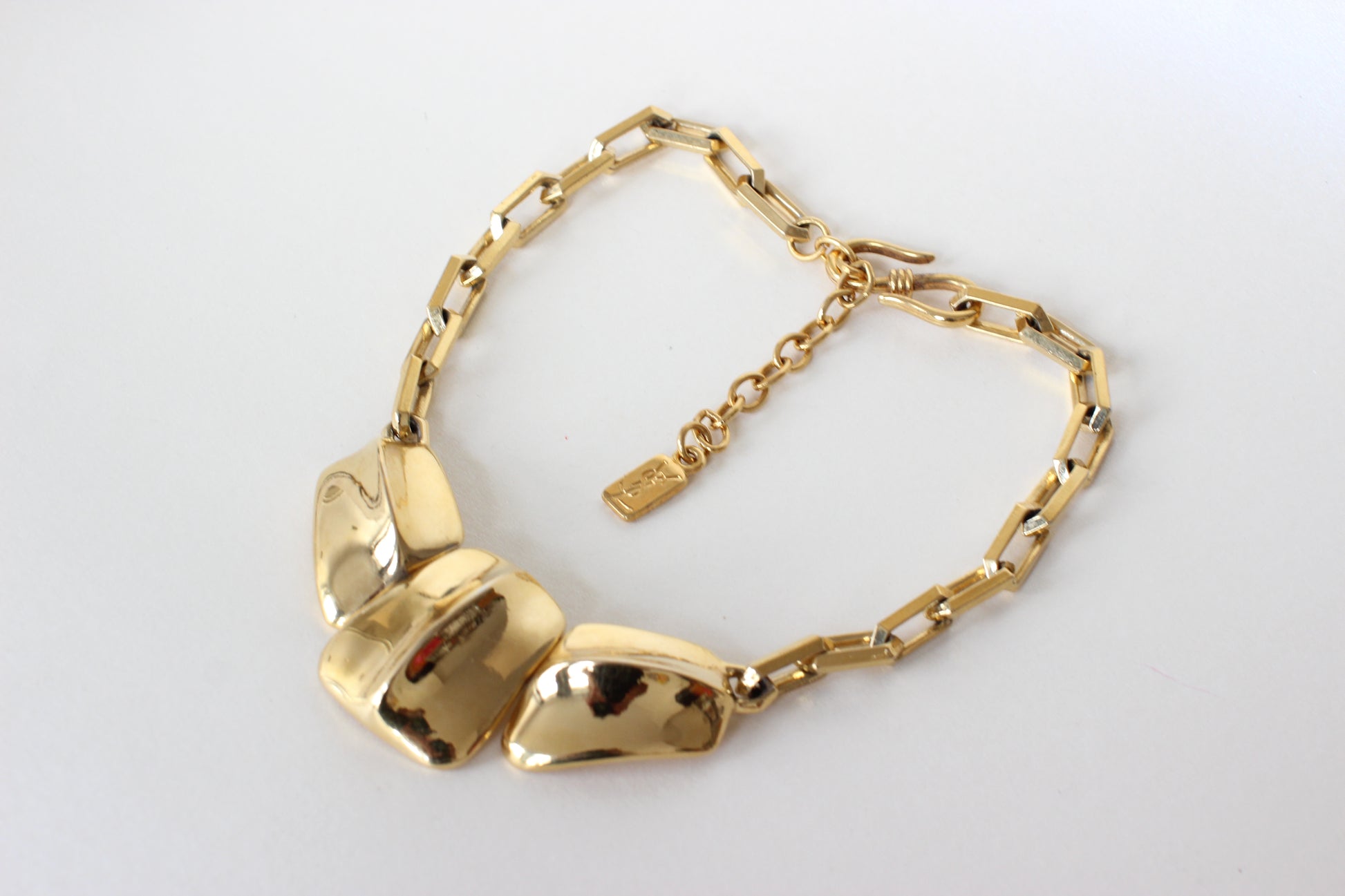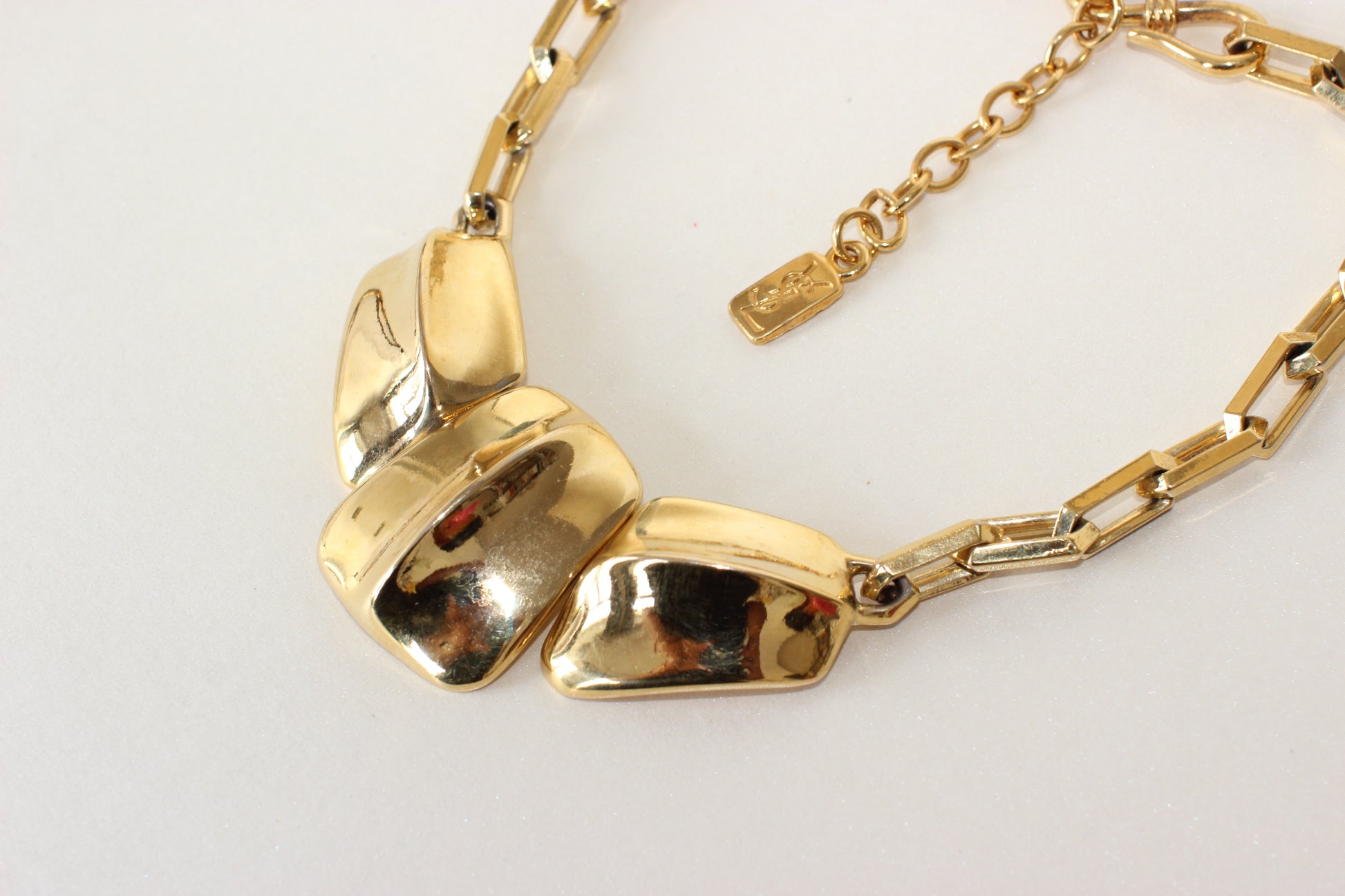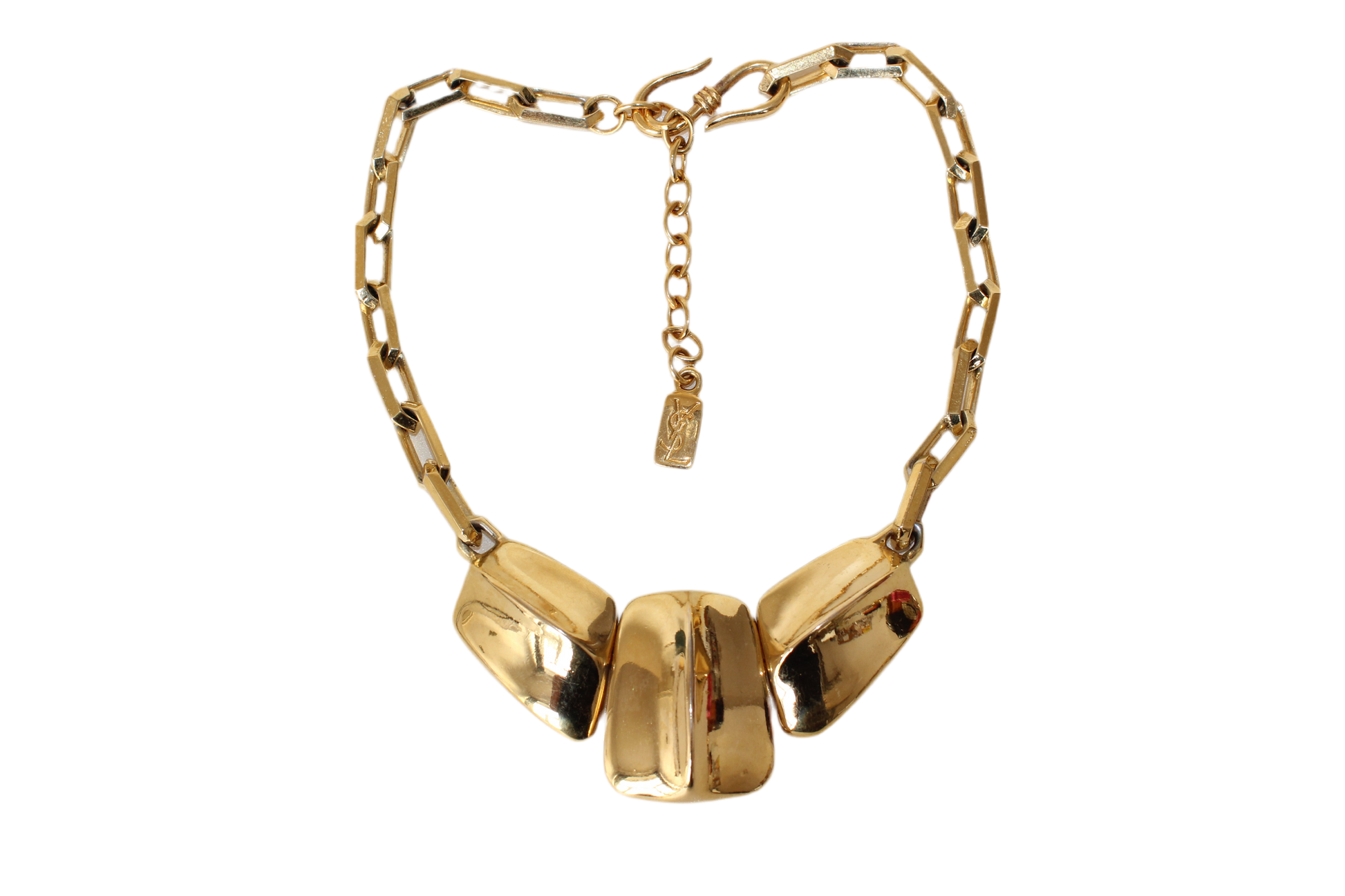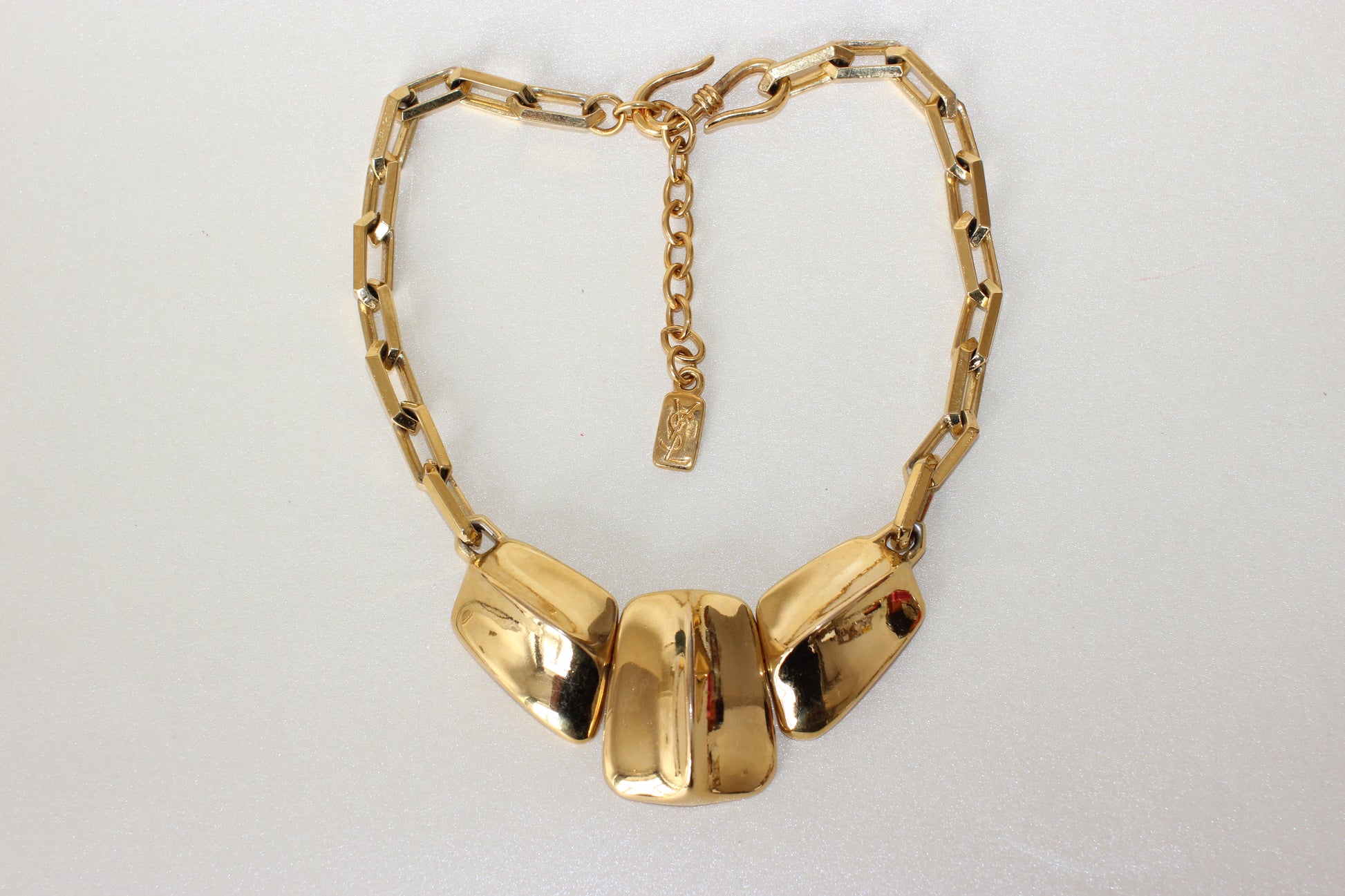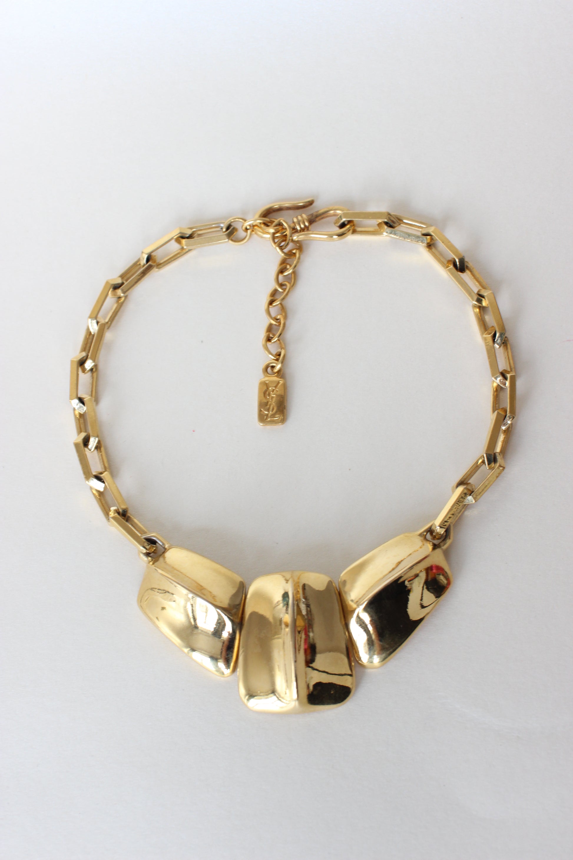 This necklace is a powerful and elegant piece of wearable art, typical of Yves Saint Laurent’s bold and confident aesthetic. The square diamond-shaped links create a strong architectural base, while the three large central elements offer both texture and movement, inspired by natural forms like reptilian skin. The warm gold tone is rich and luminous, and the necklace sits gracefully around the collar, instantly elevating any look with a touch of dramatic vintage glamour.