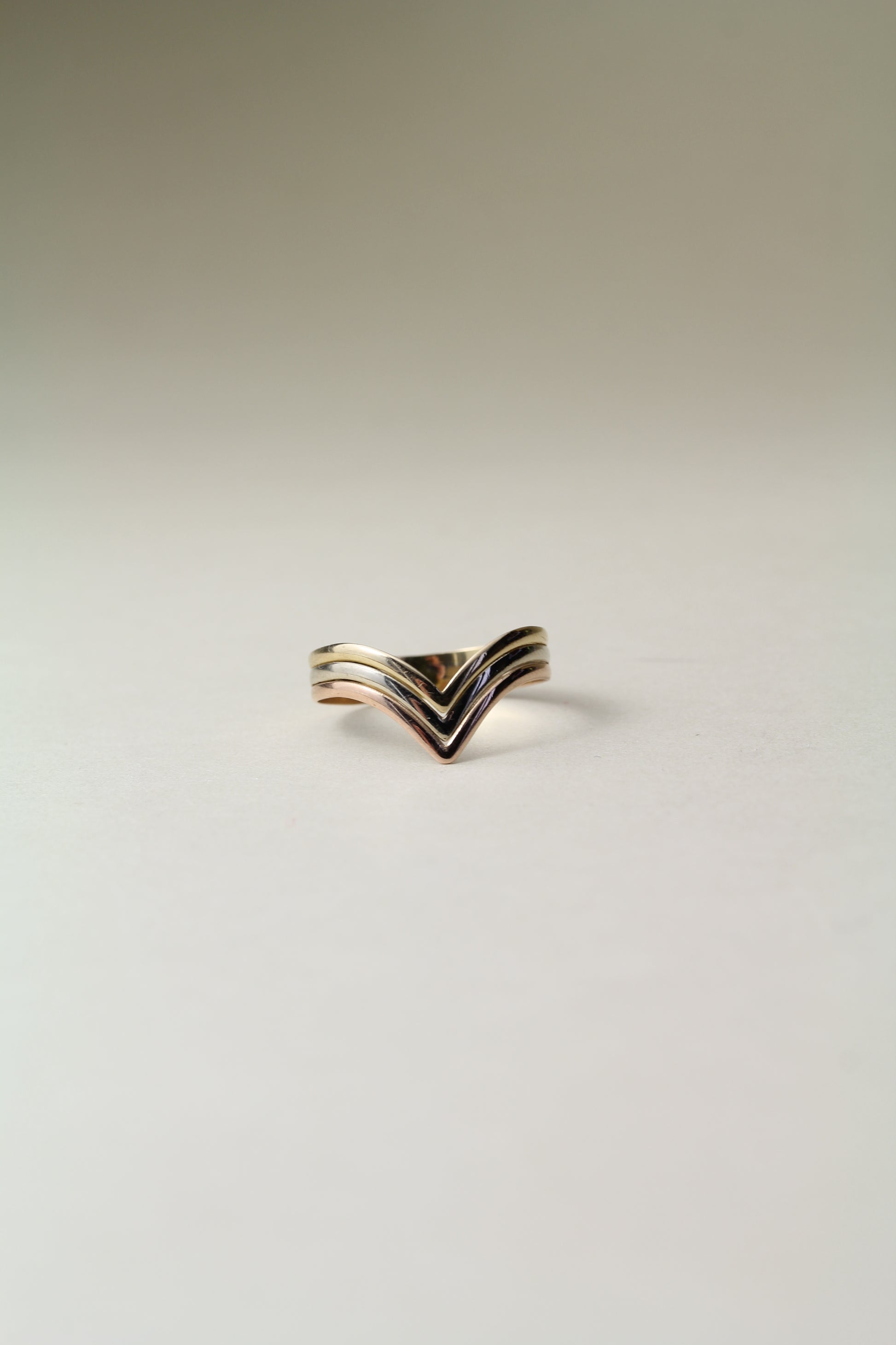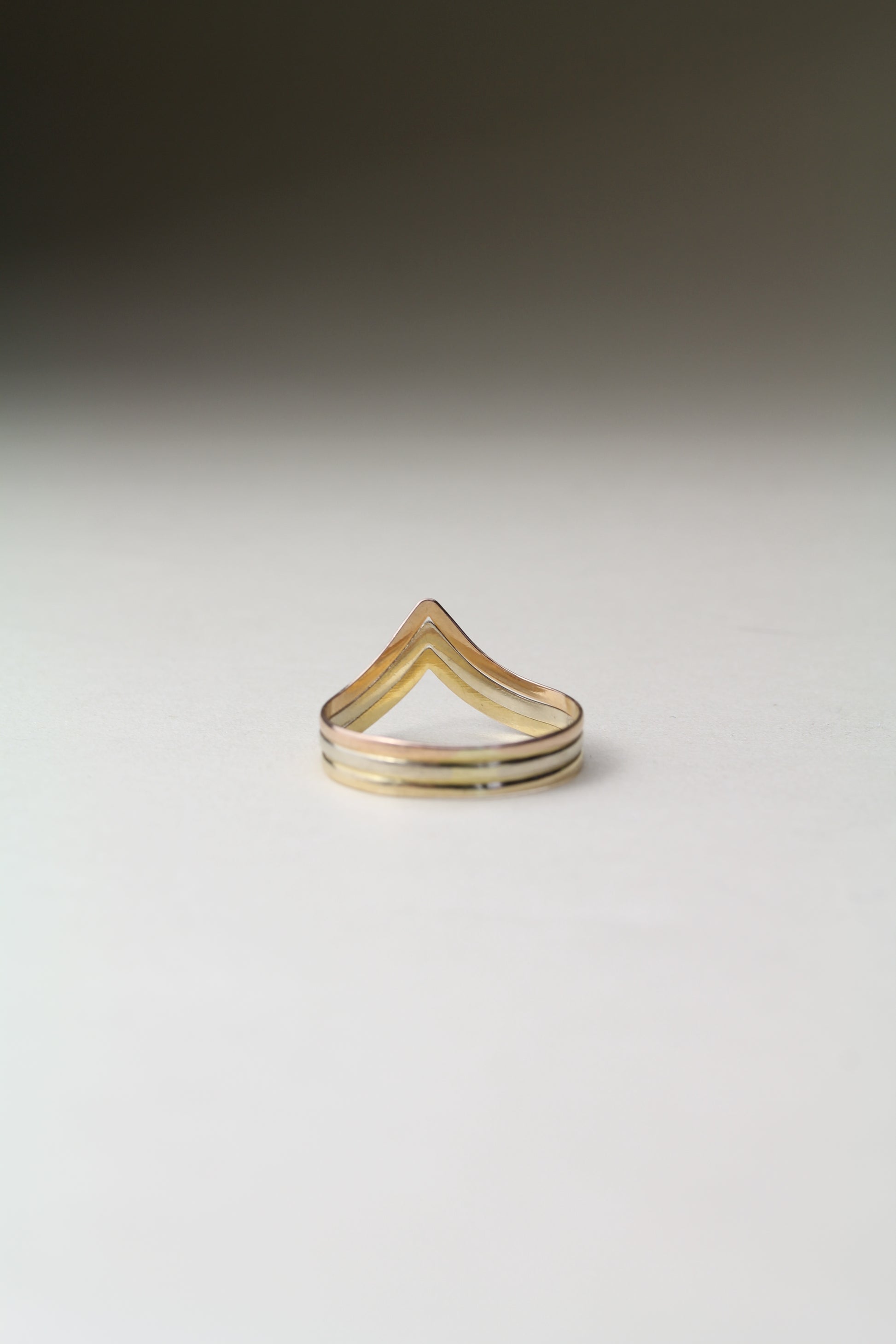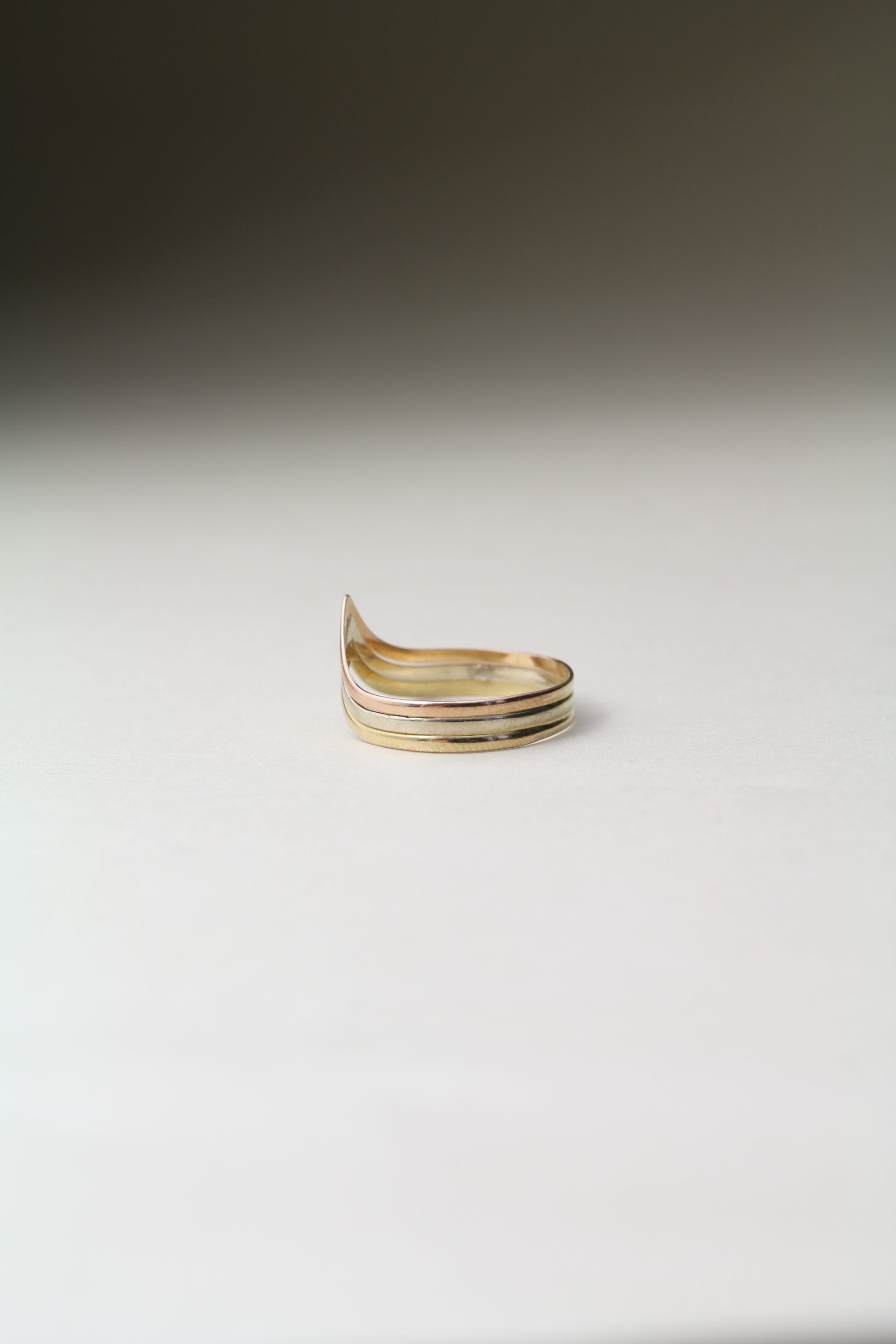 This rare 1980s design combines three tones of gold in a sleek, modern silhouette that enhances the hand beautifully. Its minimalist yet luxurious style makes it versatile enough to wear alone or stacked with other rings.