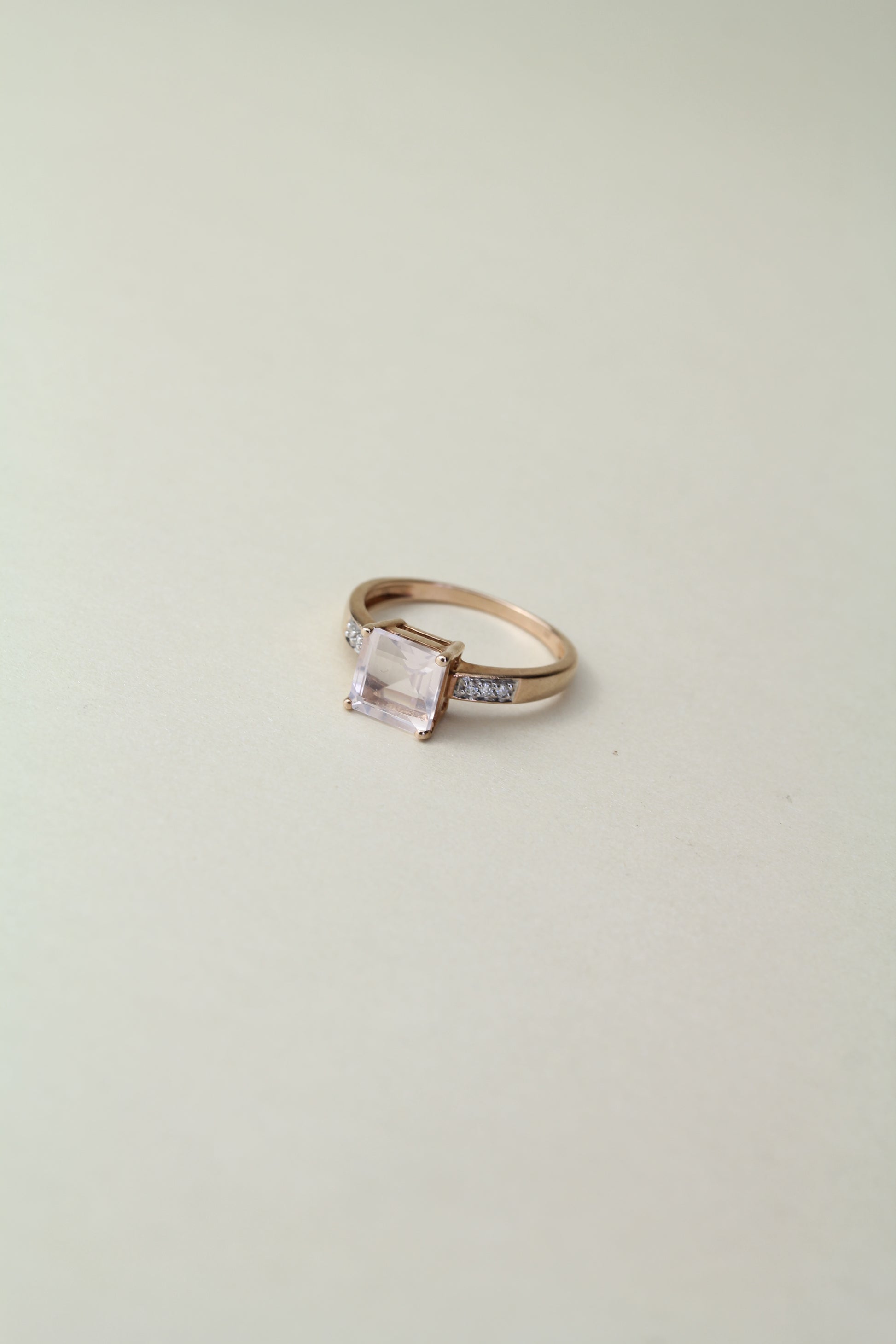 A breathtaking and feminine statement piece, this Vendôme Paris cocktail ring is crafted in solid 9k rose gold and set with a magnificent square-cut pink-lilac quartz, whose delicate pastel tones shift beautifully with the light. The central stone is framed by six sparkling diamonds, adding brilliance and refinement while enhancing the architectural elegance of the design. A true Parisian jewel, combining sophistication, romantic hues, and timeless craftsmanship.