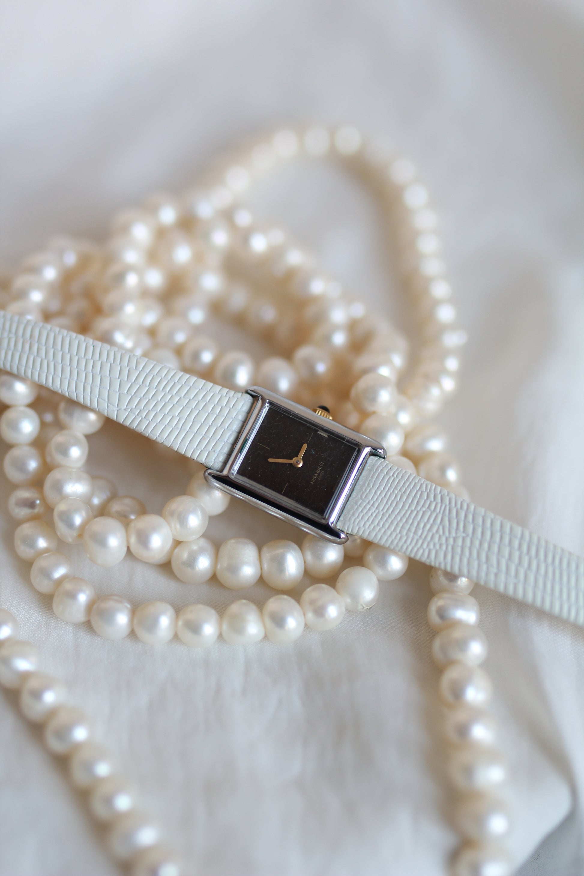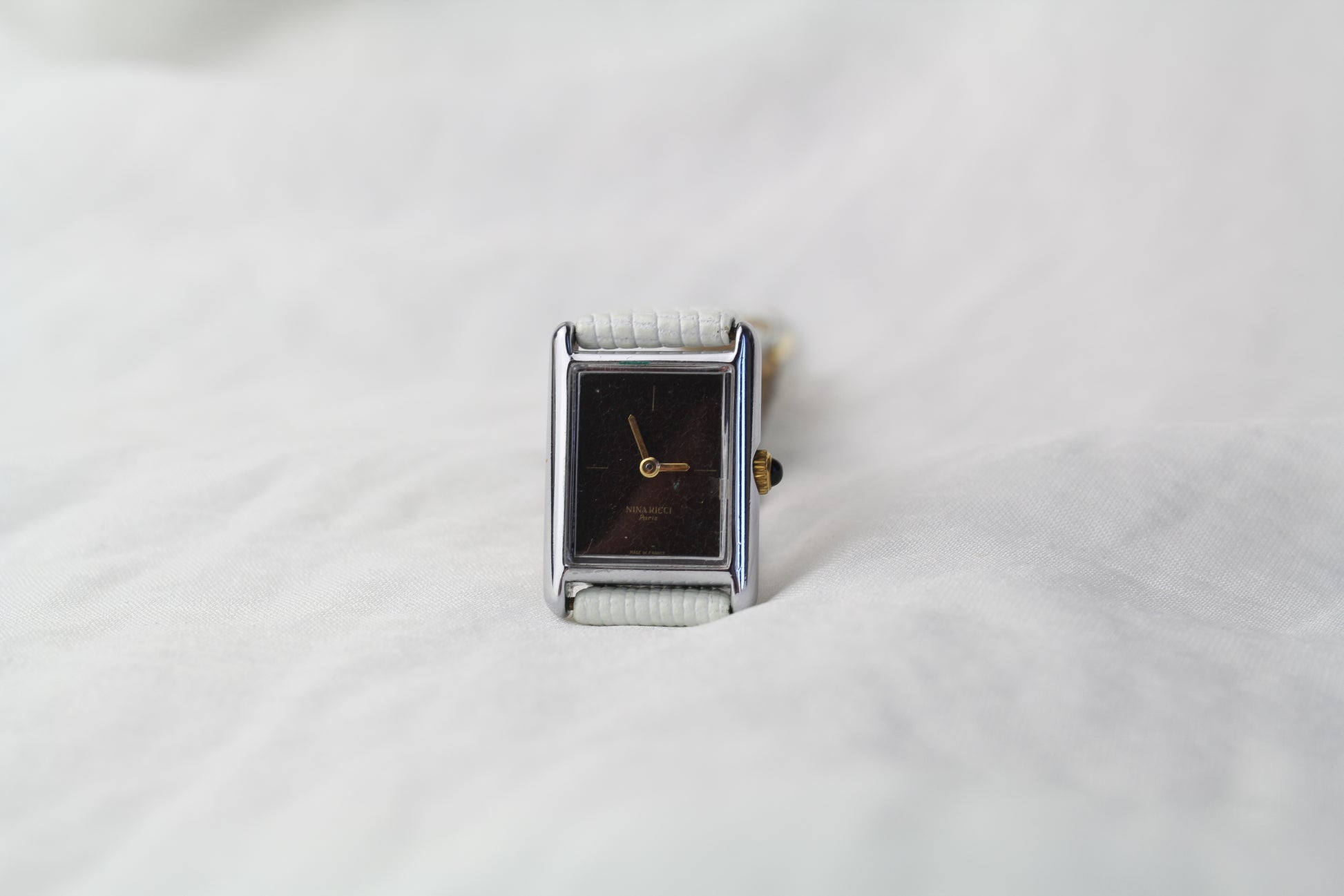 This stunning Nina Ricci tank watch from the 1980s has been carefully refreshed while preserving all its vintage charm. The glass has been fully repolished, the tank-shaped silver-tone case has been polished again, and the original strap has been replaced with a brand-new genuine white leather strap, giving the piece a unique and refined look. The crown is gold-toned, matching the new buckle for a harmonious finish. Inside, the dial reveals a rare and elegant brown-grey tone, showing gentle signs of time yet retaining all its beauty and sophistication. Powered by a mechanical movement, this watch embodies the timeless appeal of 1980s fashion watches.