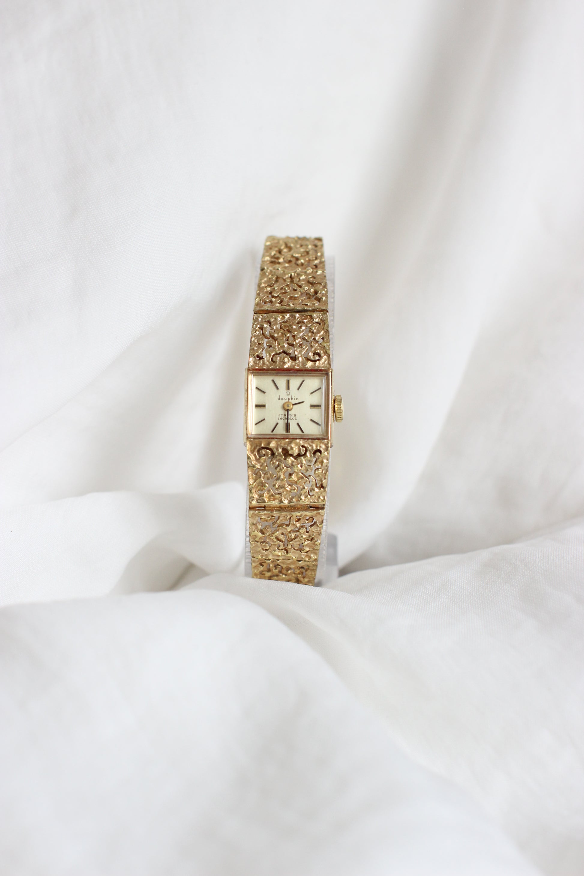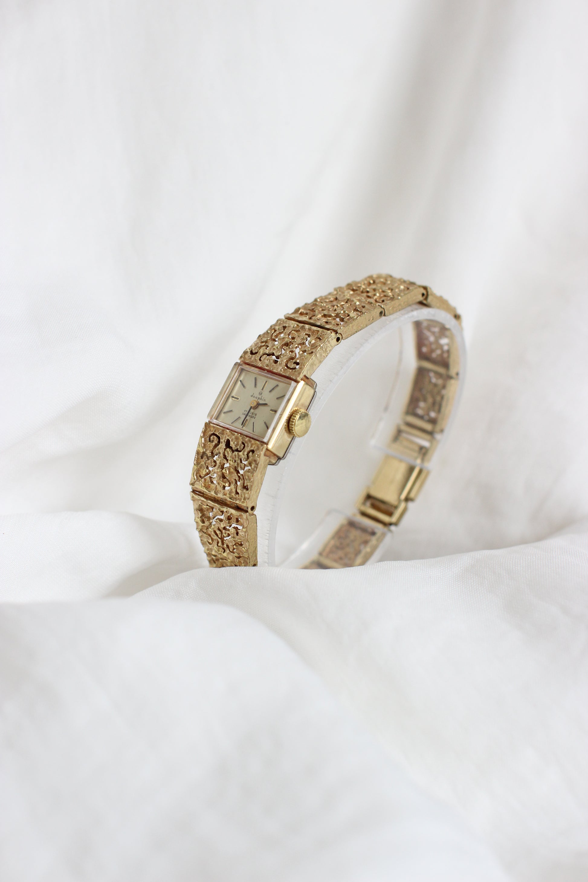 A delicate vintage Dauphin mechanical watch from the 1960s, featuring an intricately woven mesh bracelet reminiscent of lace. This elegant timepiece is entirely gold-plated and fitted with a round 1 cm dial, creating a subtle yet sophisticated statement. Powered by a mechanical movement with 17 jewels and Incabloc shock protection, it is both a functional and collectible piece. The watch accommodates a maximum wrist size of 17 cm, making it perfect for refined everyday wear or as part of a vintage collection.