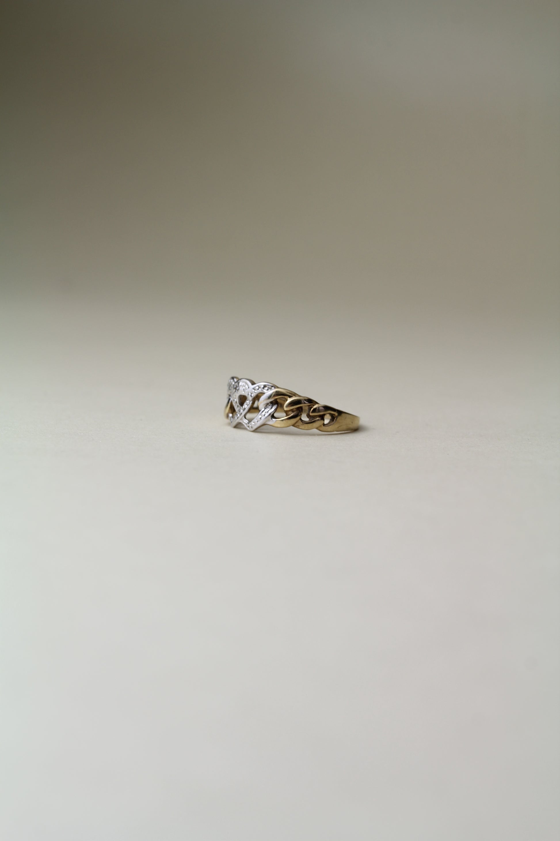 A romantic and charming vintage ring crafted in 9 karat two-tone gold – a combination of yellow and white gold. At the center, two intertwined hearts are delicately joined, symbolizing unity and affection. The hearts are set within a chain-link motif, adding a modern edge to the timeless design. A tiny central diamond sparkles subtly between the hearts. The ring is a size 51, but it can be adjusted to fit your finger upon request by our expert jeweler.