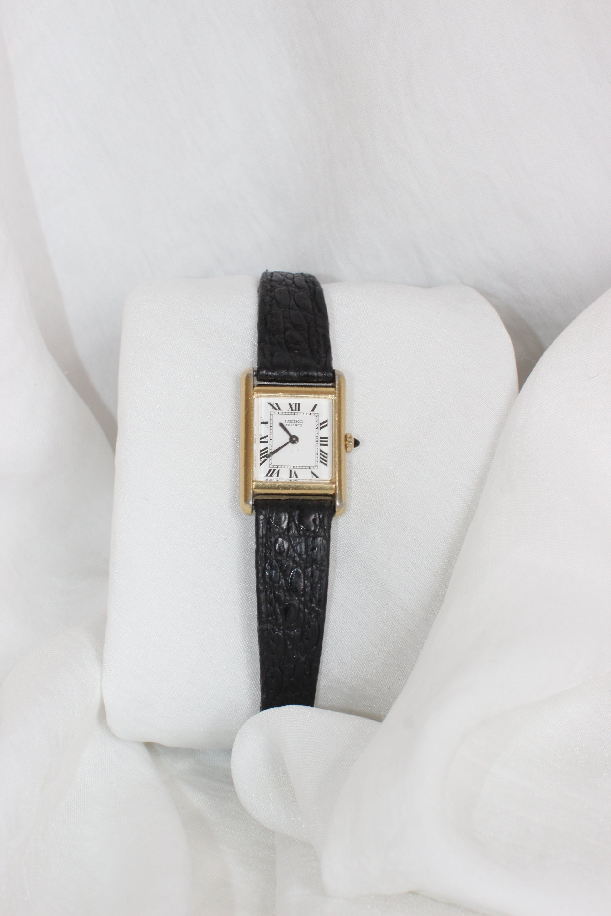 A refined and collectible Seiko Mini Tank from the 1980s, combining timeless design with vintage charm. This elegant model features a gold-plated case and a stainless steel back, showcasing Seiko’s attention to detail and durability. The white dial is adorned with bold Roman numerals and classic gold-tone hands, while a delicate sapphire cabochon sits atop the crown, adding a subtle touch of sophistication. The genuine crocodile leather strap in black enhances the piece’s luxurious appeal. Fitted with a new quartz battery, this watch is fully functional and ready to wear.