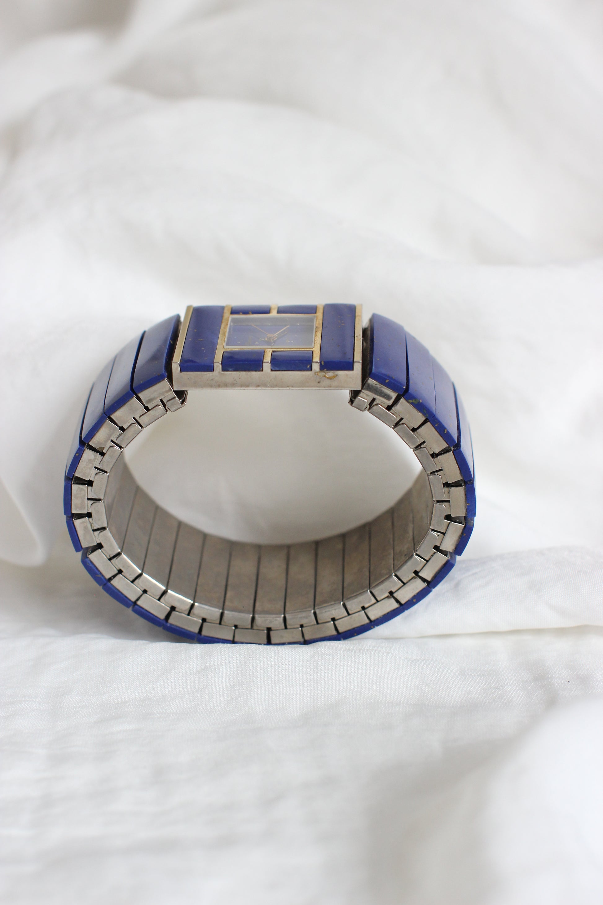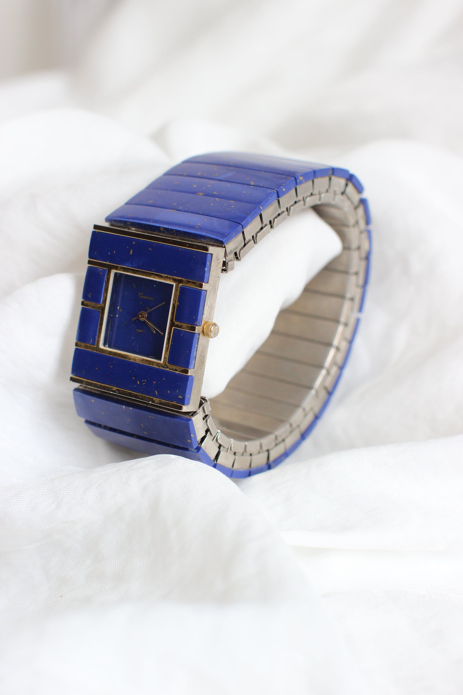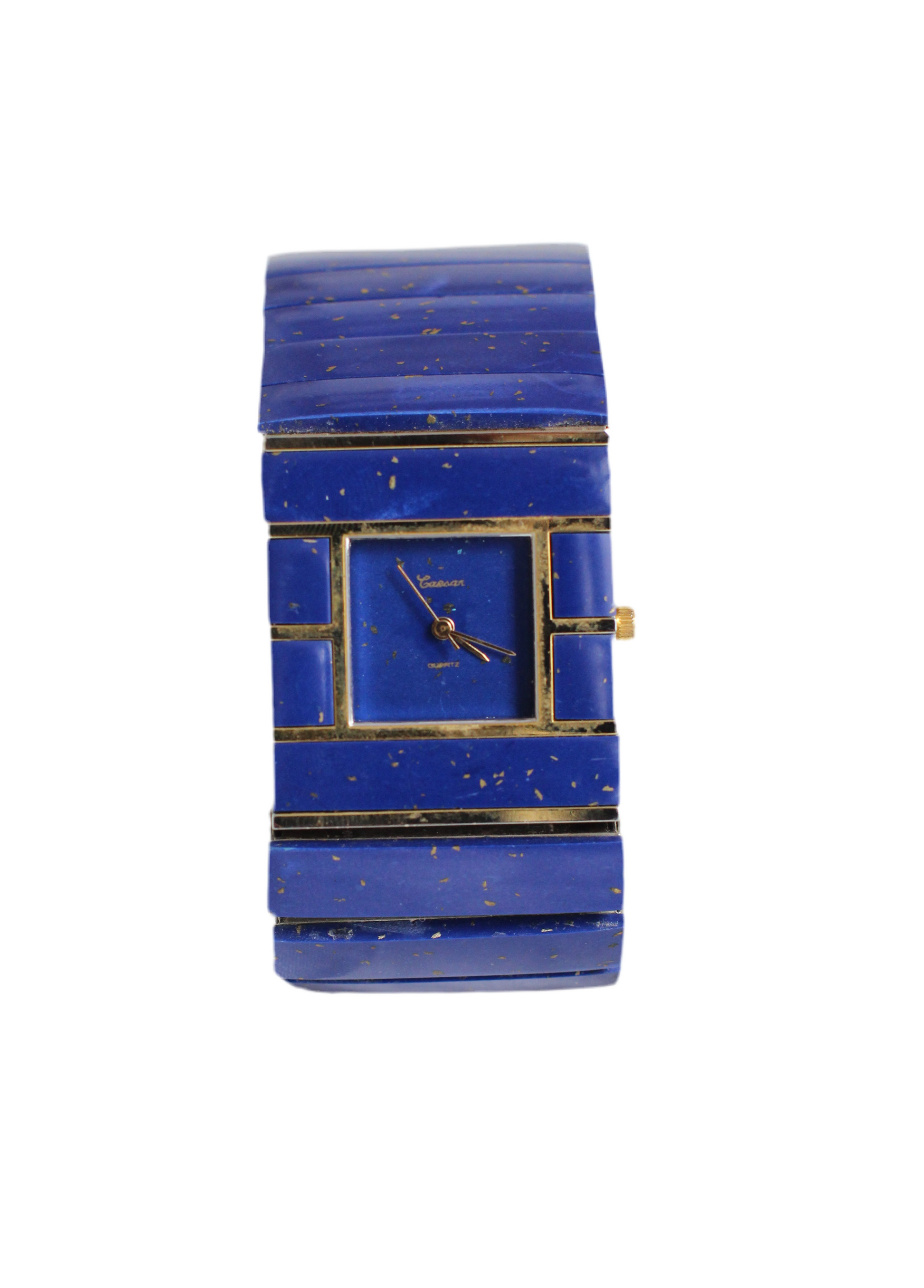 A bold and statement vintage piece from the 1980s, this watch is crafted almost entirely in deep blue lapis lazuli, giving it a striking and luxurious appearance. Designed as a wide cuff bracelet, it seamlessly blends the function of a timepiece with the elegance of a jewel. The watch houses a quartz movement with a new battery, ensuring modern reliability while preserving its vintage allure. With its rich natural stone, gold-toned details, and sculptural presence, this Carsar creation embodies the glamorous, daring spirit of the 1980s.