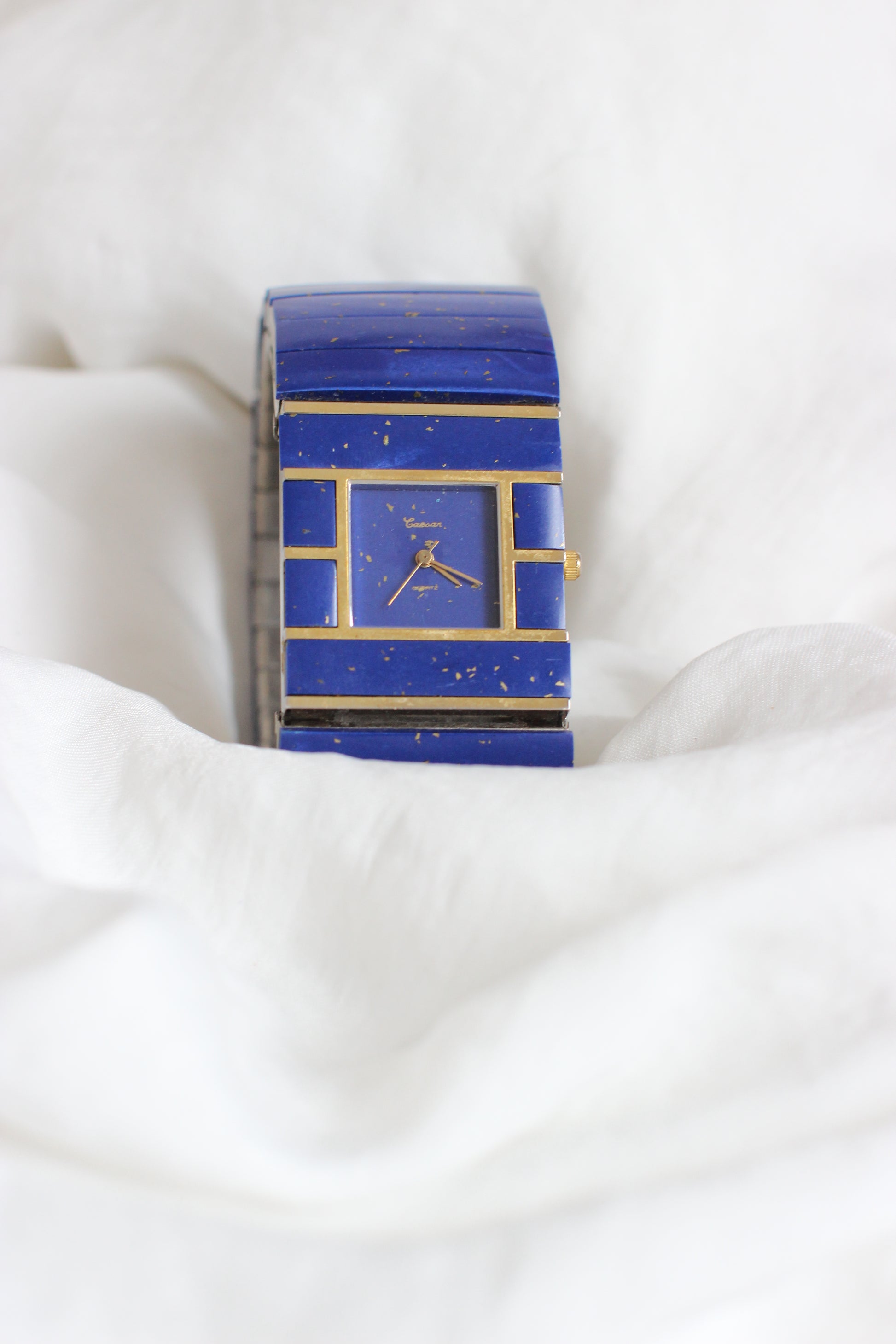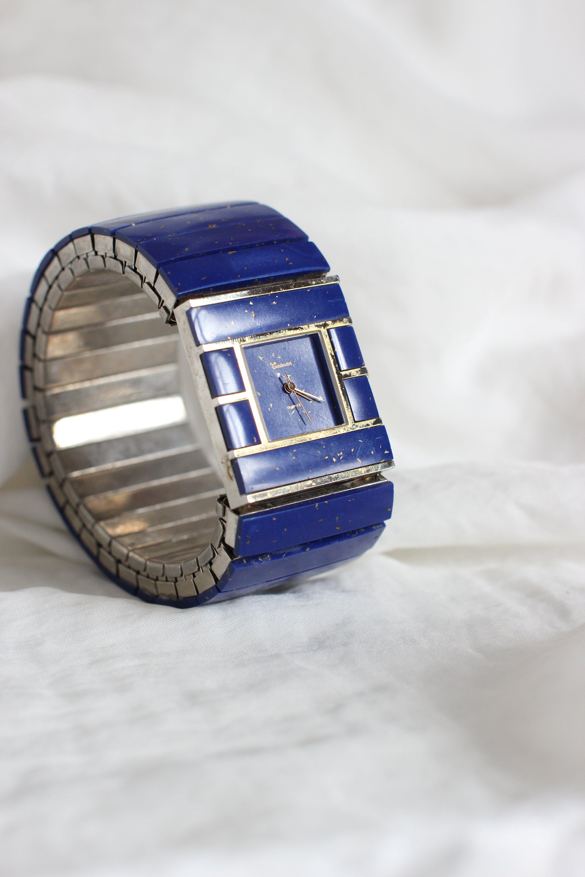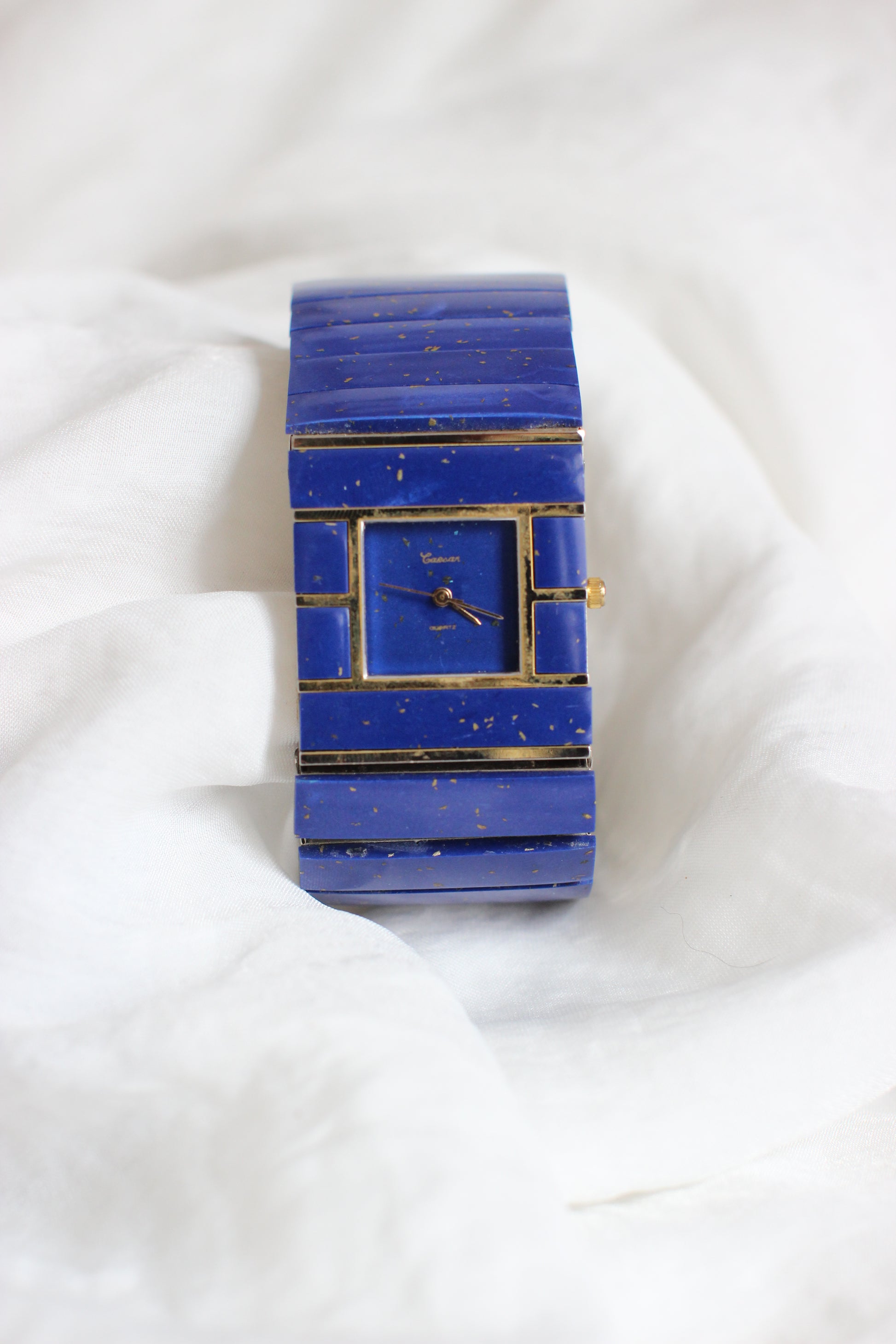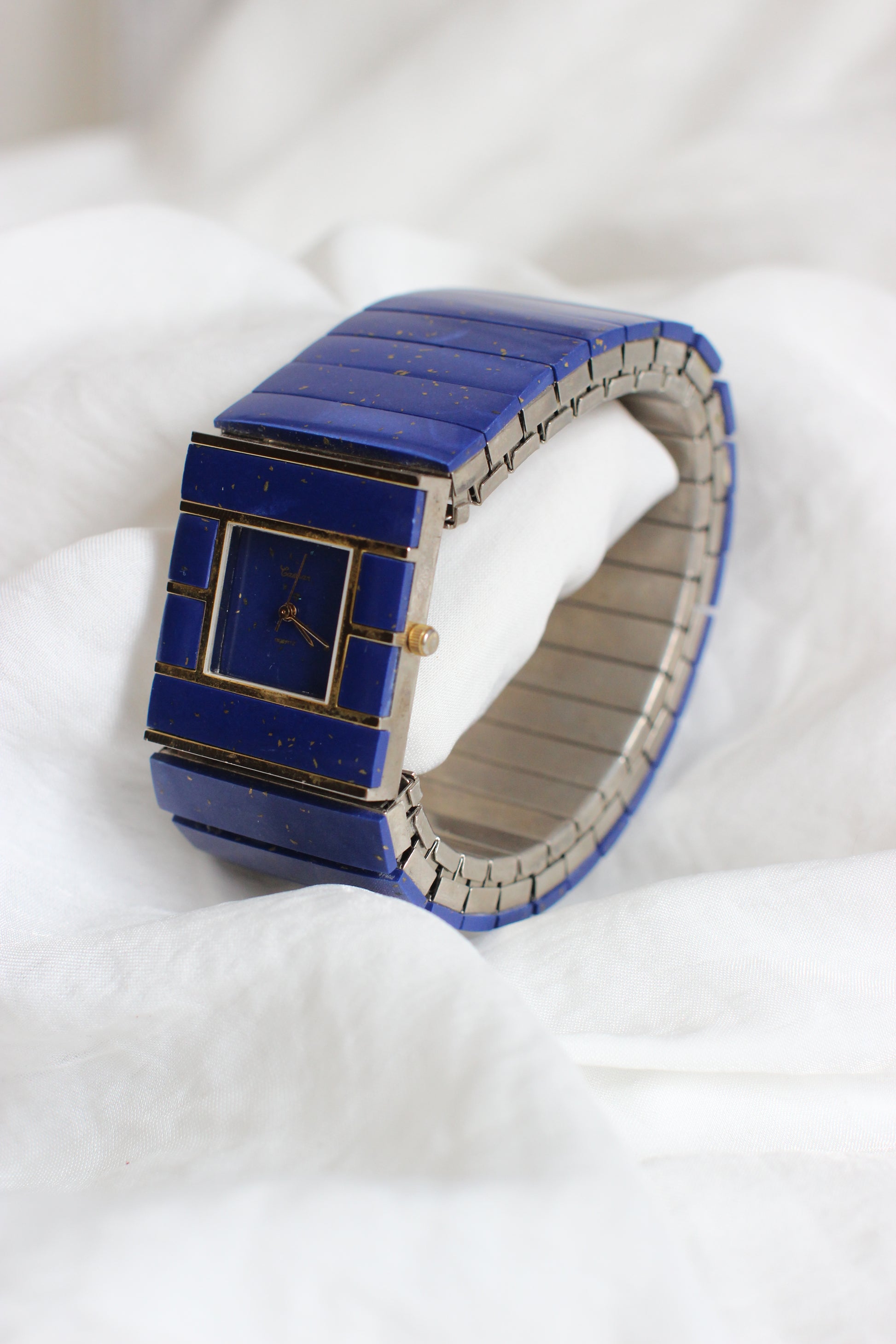 A bold and statement vintage piece from the 1980s, this watch is crafted almost entirely in deep blue lapis lazuli, giving it a striking and luxurious appearance. Designed as a wide cuff bracelet, it seamlessly blends the function of a timepiece with the elegance of a jewel. The watch houses a quartz movement with a new battery, ensuring modern reliability while preserving its vintage allure. With its rich natural stone, gold-toned details, and sculptural presence, this Carsar creation embodies the glamorous, daring spirit of the 1980s.