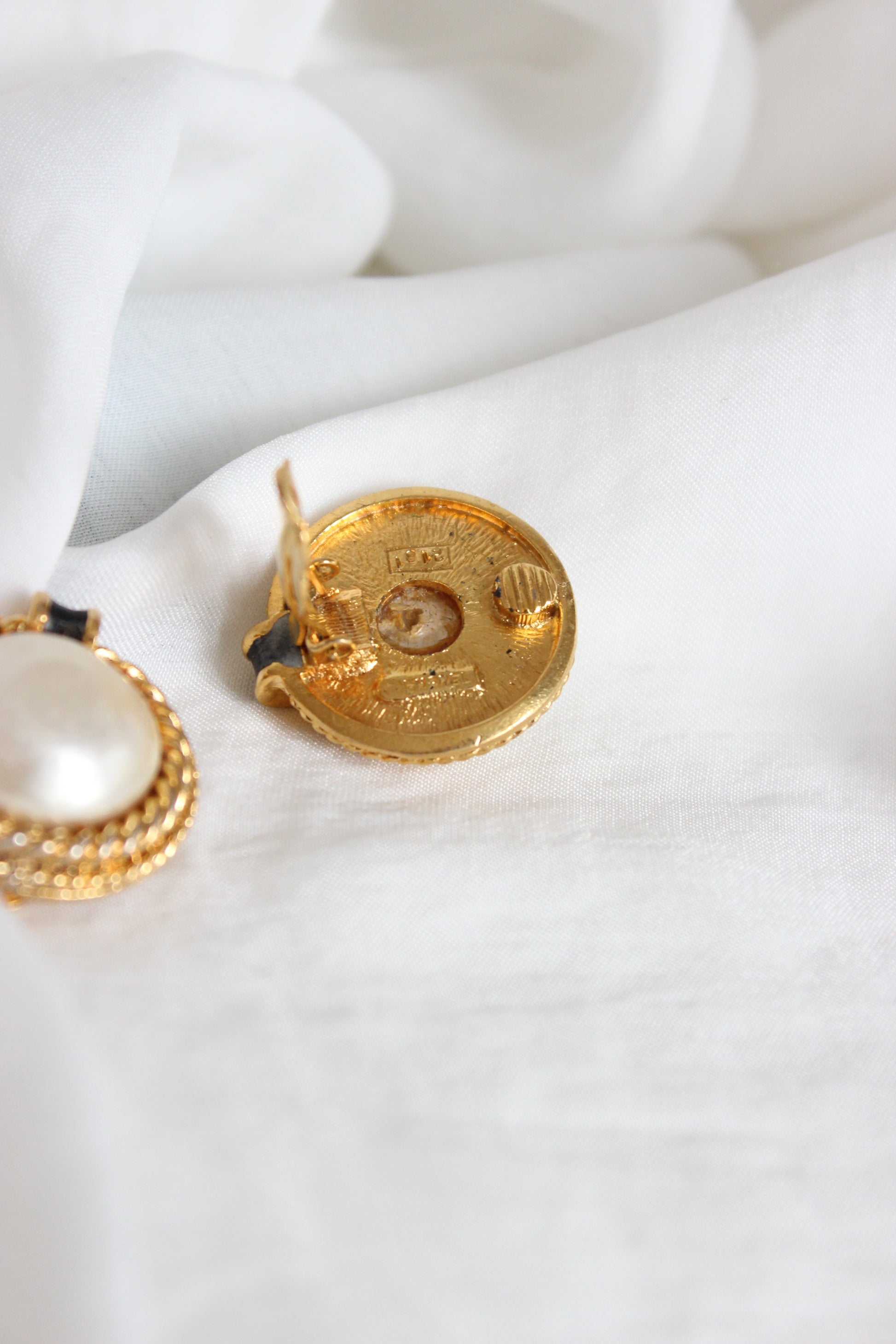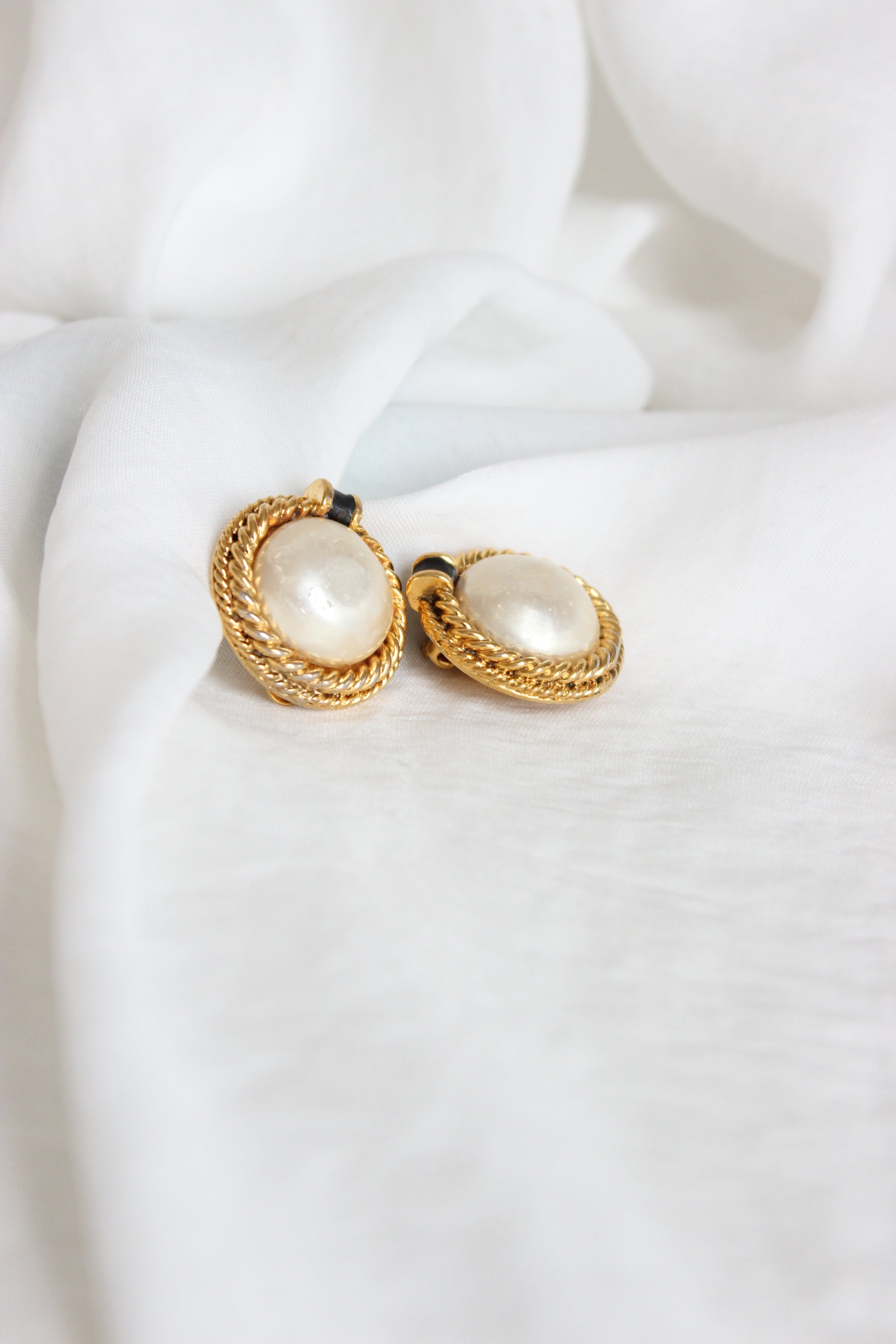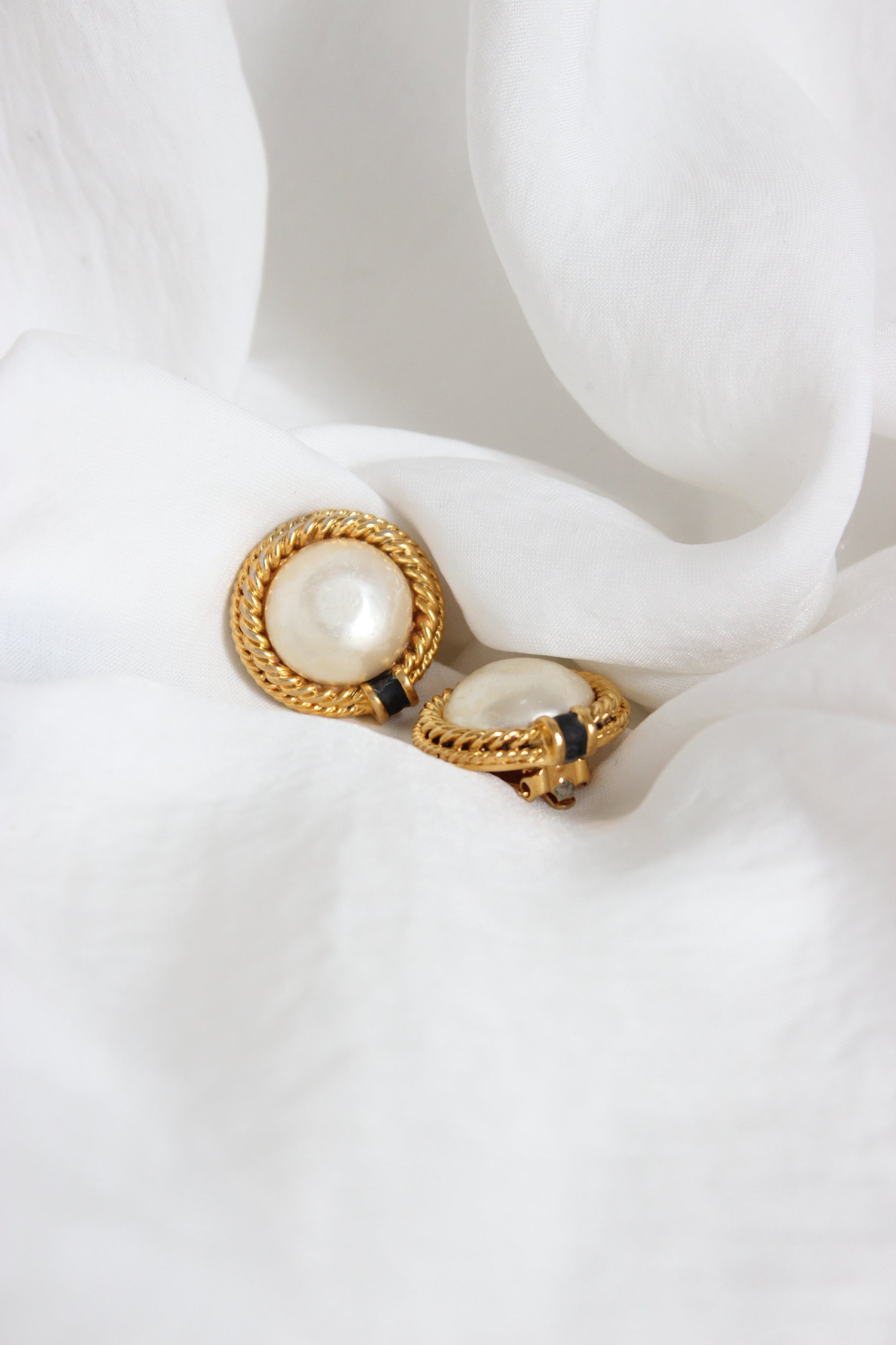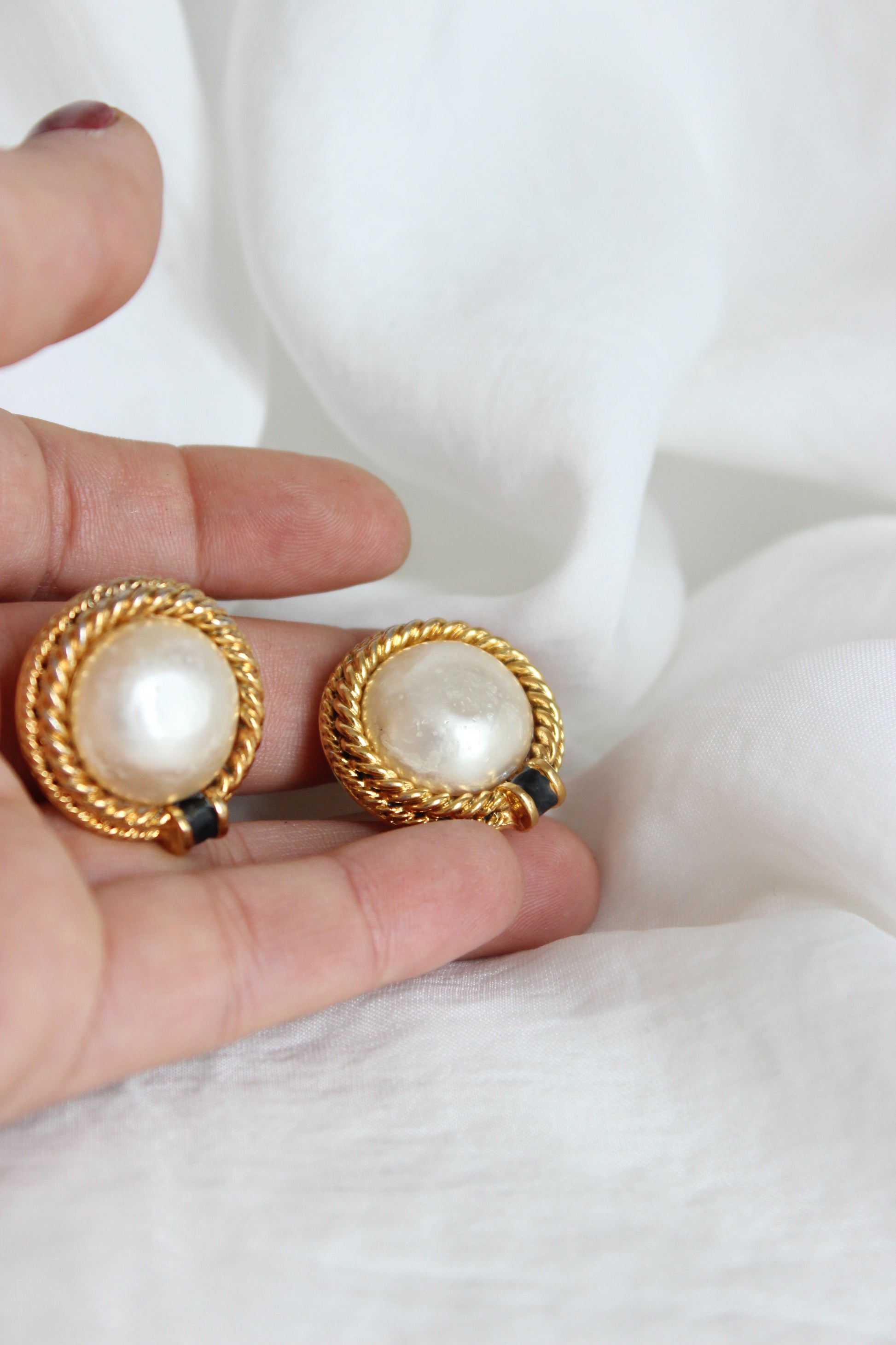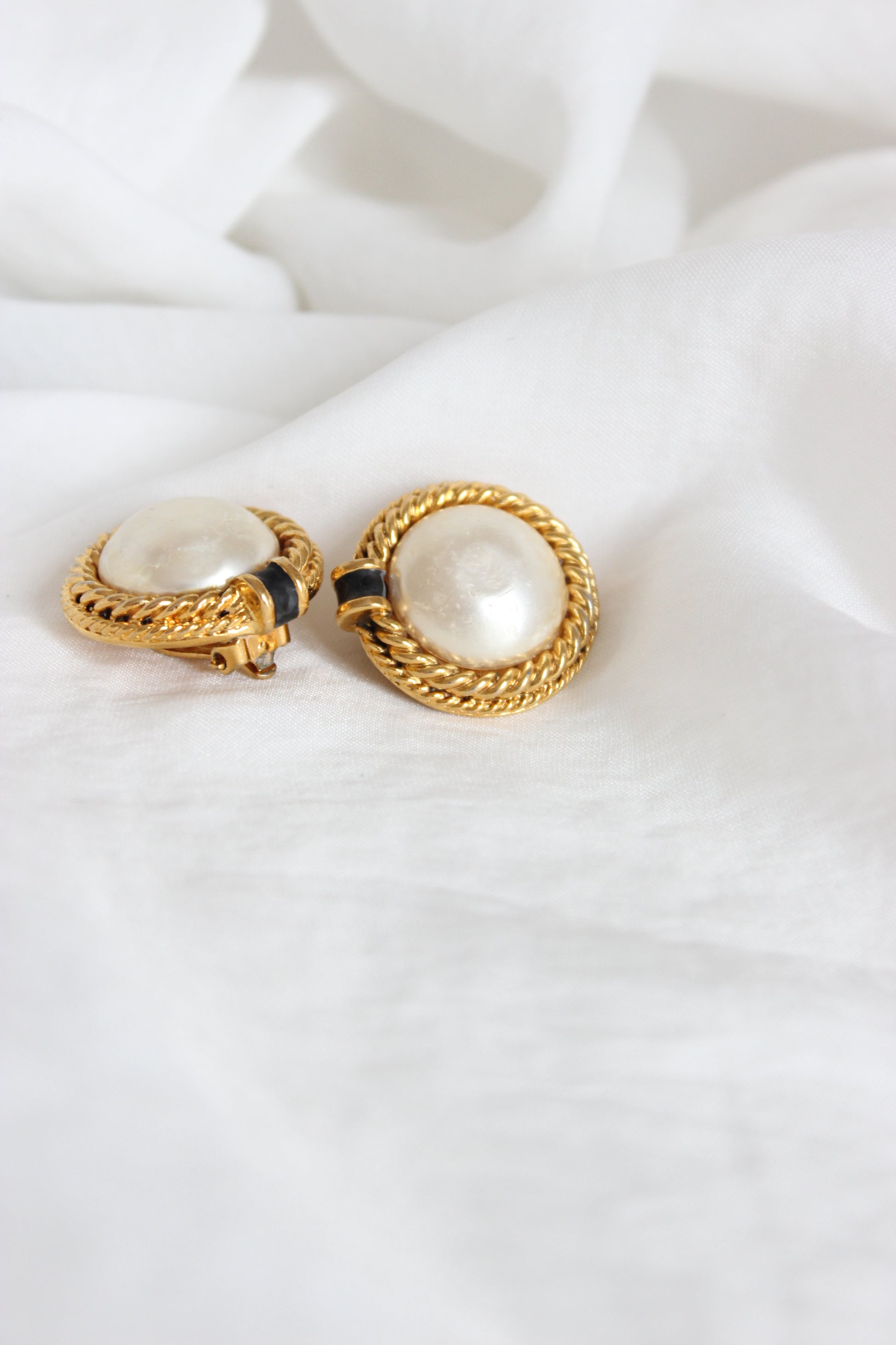 These exquisite Chanel clip-on earrings from the 1980s, a perfect blend of classic and bold design. Their round shape, approximately 2.5 cm in diameter, features a central faux pearl framed by a double twisted gold-tone braid. Adding a modern twist, a sleek black enamel stripe adorns the bottom edge of the earrings. While the faux pearl showcases some light surface wear, these earrings remain an iconic statement piece, embodying timeless Chanel sophistication.