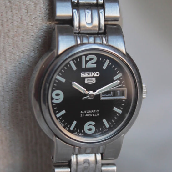 This elegant Seiko 5 Classic Ladies watch combines timeless design with the renowned reliability of Japanese watchmaking. Featuring a sleek black dial and a compact stainless steel case, this model is perfectly proportioned for smaller wrists while retaining the technical excellence that defines the Seiko 5 line. A refined yet practical timepiece, ideal for daily wear.
