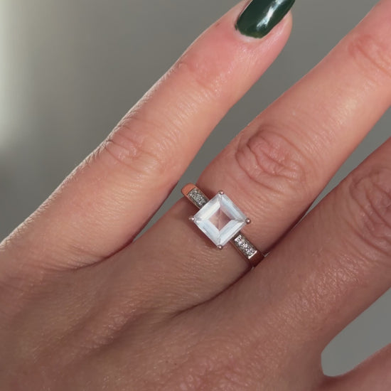 A breathtaking and feminine statement piece, this Vendôme Paris cocktail ring is crafted in solid 9k rose gold and set with a magnificent square-cut pink-lilac quartz, whose delicate pastel tones shift beautifully with the light. The central stone is framed by six sparkling diamonds, adding brilliance and refinement while enhancing the architectural elegance of the design. A true Parisian jewel, combining sophistication, romantic hues, and timeless craftsmanship.