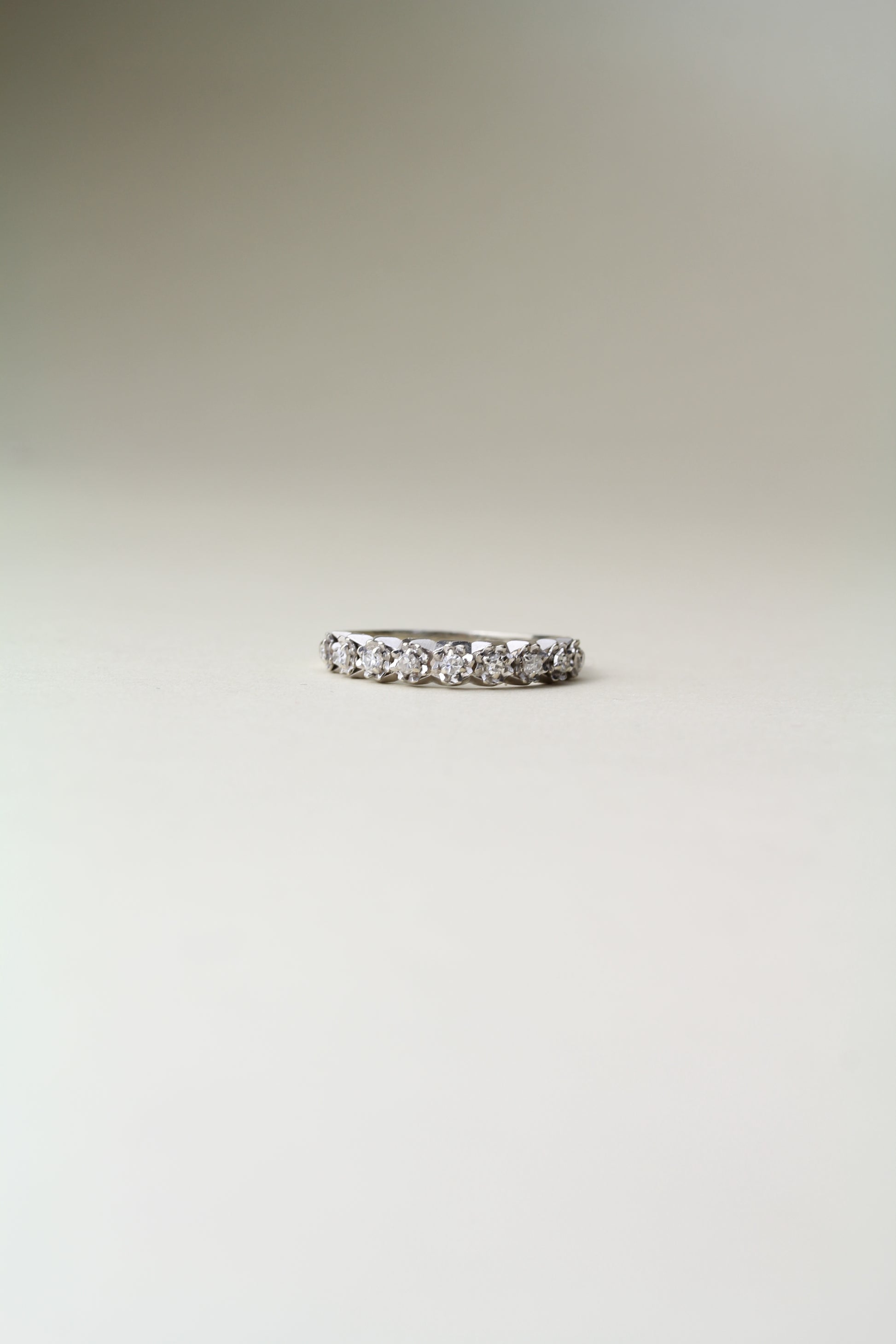 This elegant half-eternity ring is a stunning example of Art Deco craftsmanship, featuring 9 brilliant-cut diamonds individually set within hand-carved micro-floral settings. The ring is crafted in platinum, harmonizing strength with refined brilliance. Though engraved inside with the date 1972, the piece itself is clearly older, likely dating from the Art Deco era.